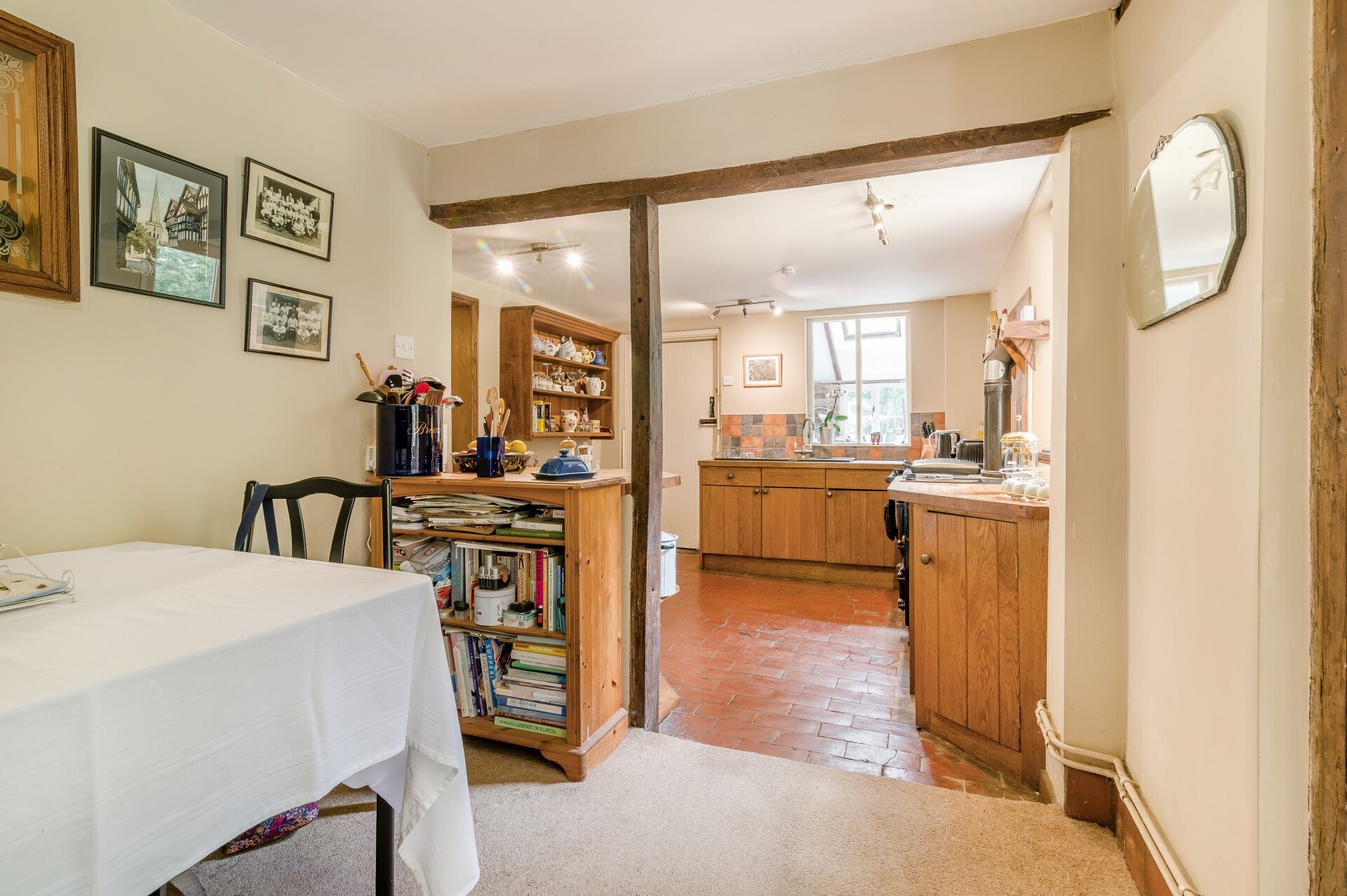 From the hallway, you have two doors, one leading into a spacious living room, with quarry tiled floor, a sash window overlooking the gardens to the front, exposed ceiling beams and feature fireplace with wood burning stove. The other door gives access to a dining room with a double aspect through shuttered window to side and front, feature fireplace with wood burning stove, and quarry tiled floor.