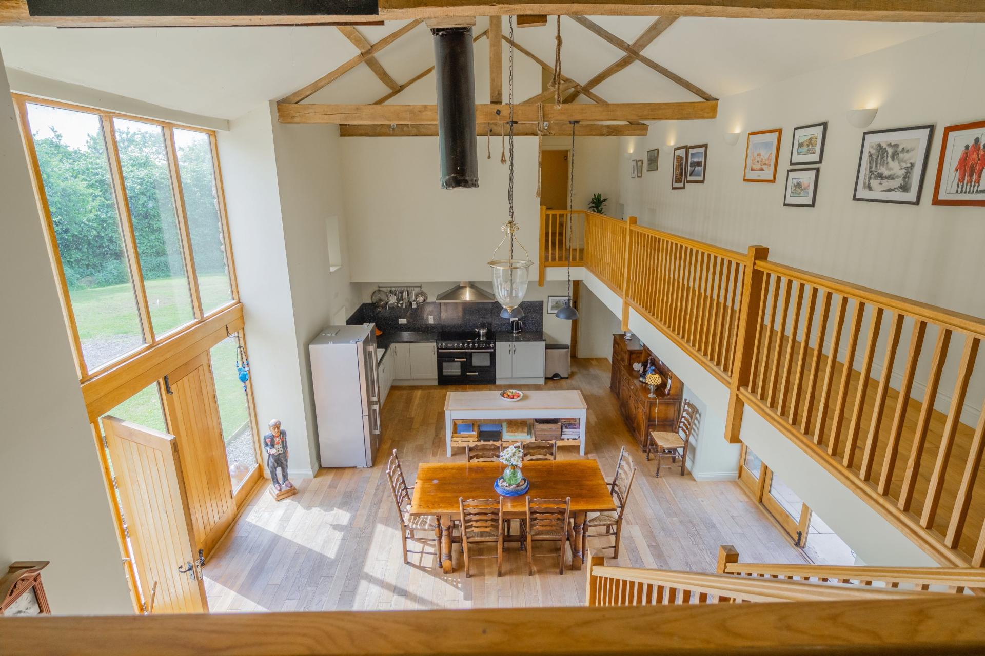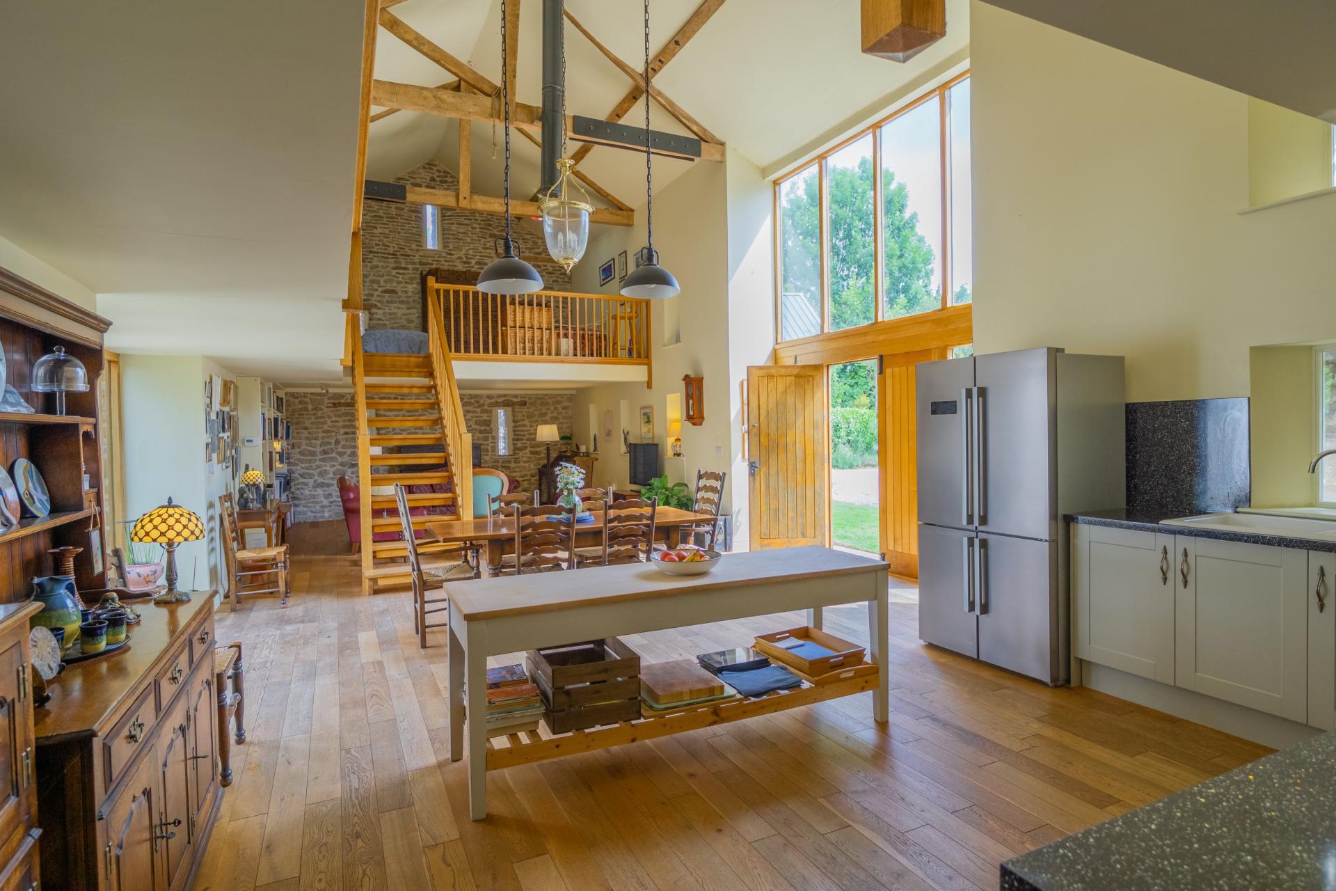 Step Inside The Barn - This once tumbledown threshing barn has undergone a complete renovation and is now a wonderfully spacious property measuring approximately 1960 sq ft. It showcases open-plan living at its finest, with glazed doors on either side allowing natural light to flood in. A centrally positioned modern kitchen, living, and dining area sits beneath a vaulted ceiling, creating a real sense of space. Just off the kitchen is a walk-in pantry.