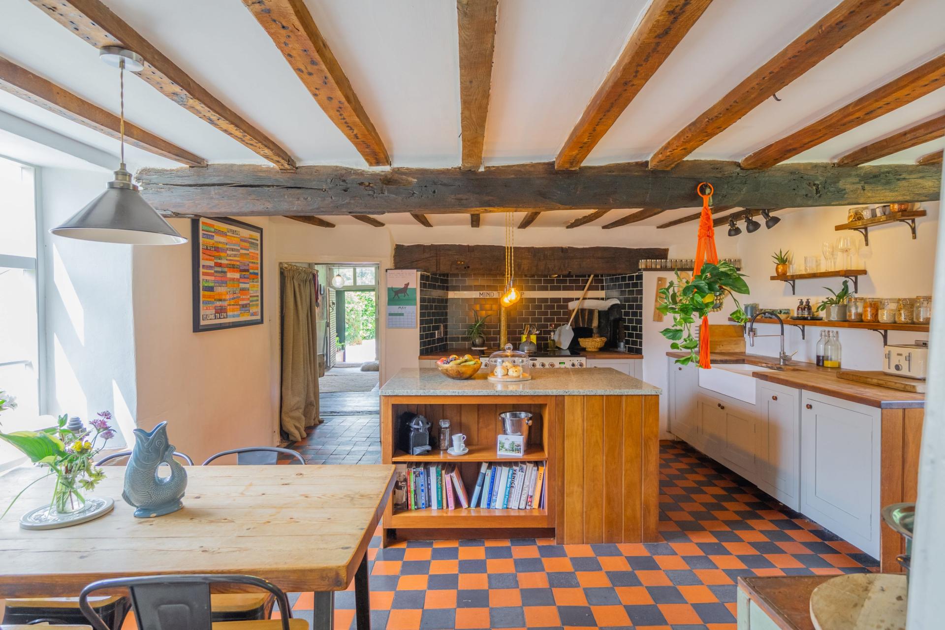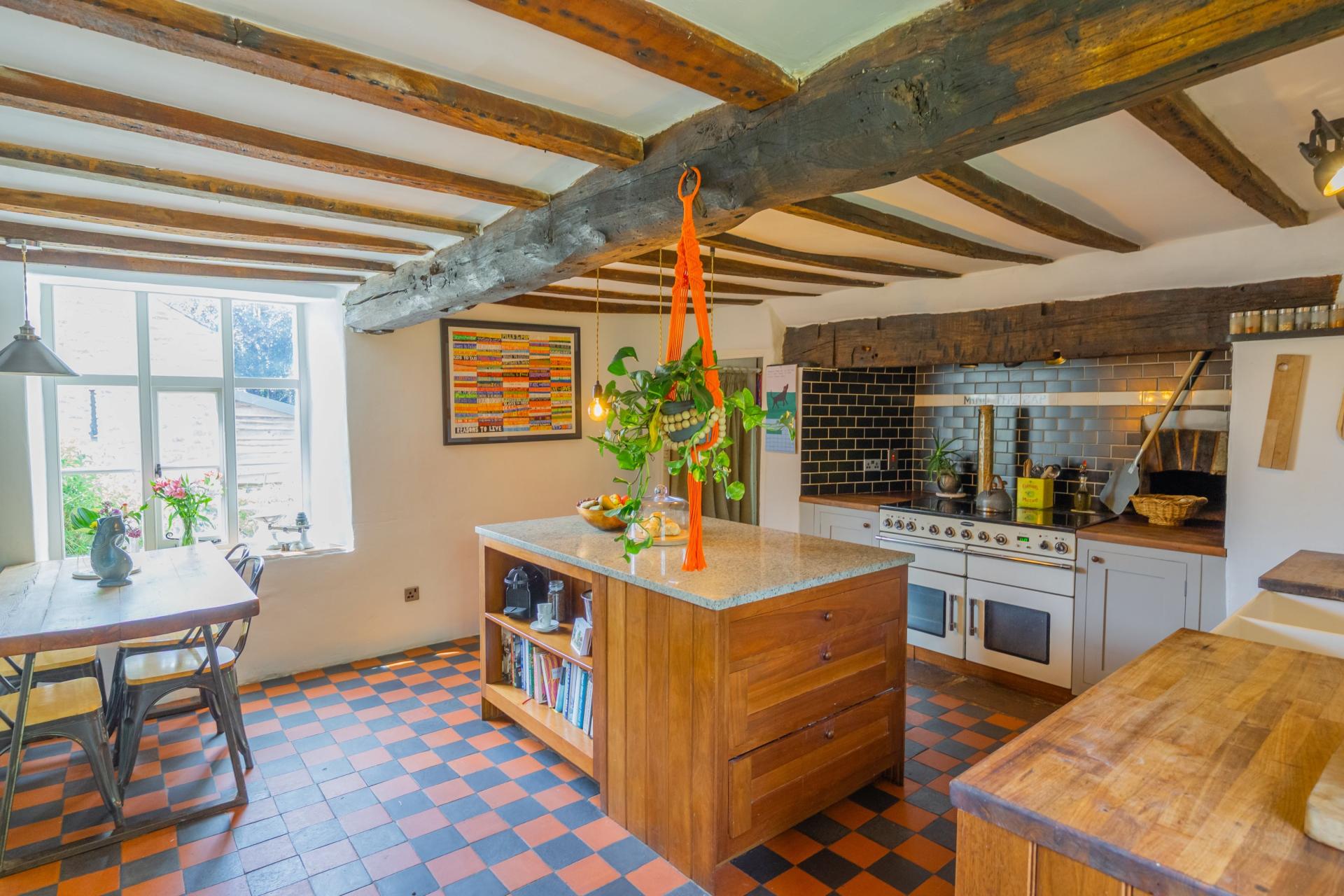 To the rear of the house is the farmhouse kitchen, complete with an original inglenook fireplace housing a Rangemaster cooker (included in the sale), and the original bread oven with potential to be reinstated as a pizza oven. Designed with a rustic feel, the kitchen reflects the owners' desire to preserve its heritage. The quarry tile flooring remains in situ, while sympathetic modern additions include a central island and cabinetry painted in Fired Earth's Oak Apple', with an inset Belfast sink and integrated dishwasher. There is ample space for a dining table, and a stable door opens out to the garden.