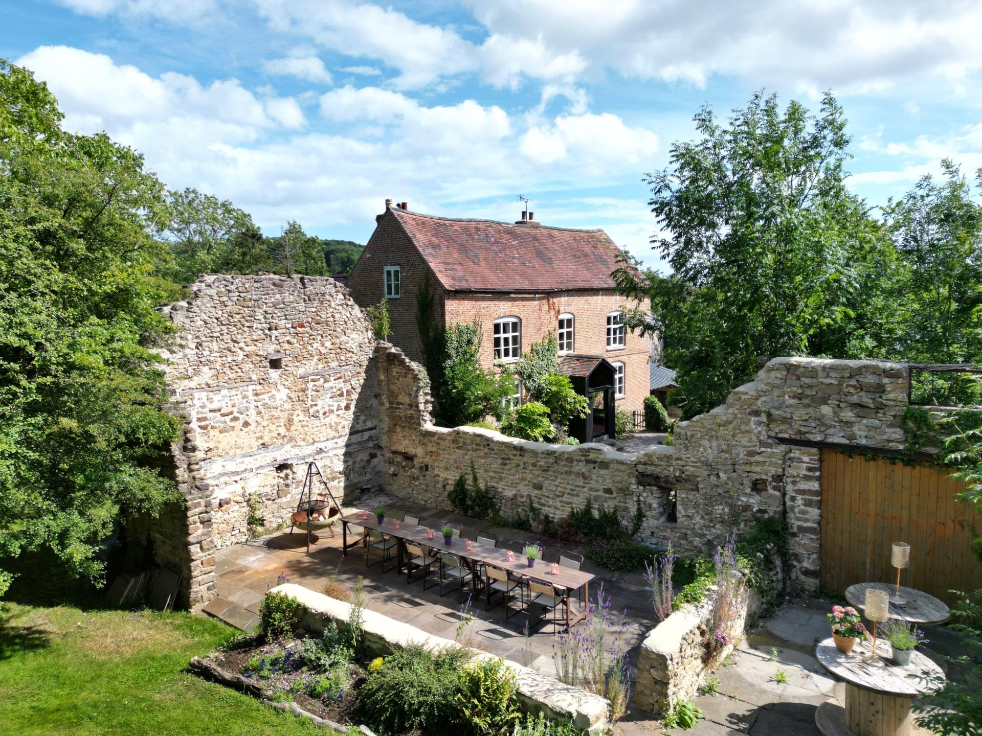 The owners have successfully run a glamping business onsite, with four well-positioned yurtseach with its own outdoor dining area, and three featuring private hot tubs. Supporting the business is a dedicated outdoor kitchen, a dog wash, and a unique dining and entertaining area set within the footprint of a former ruin, echoing the size and character of the restored threshing barn nearby. There is potential to restore the ruined barn subject to gaining any necessary planning consents. A football pitch provides additional space for guests to enjoy. Facilities for glamping guests also include a shower room close to the outdoor kitchen, as well as three further shower rooms and an indoor seating areaaccessed via an external staircase attached to the main farmhouse.