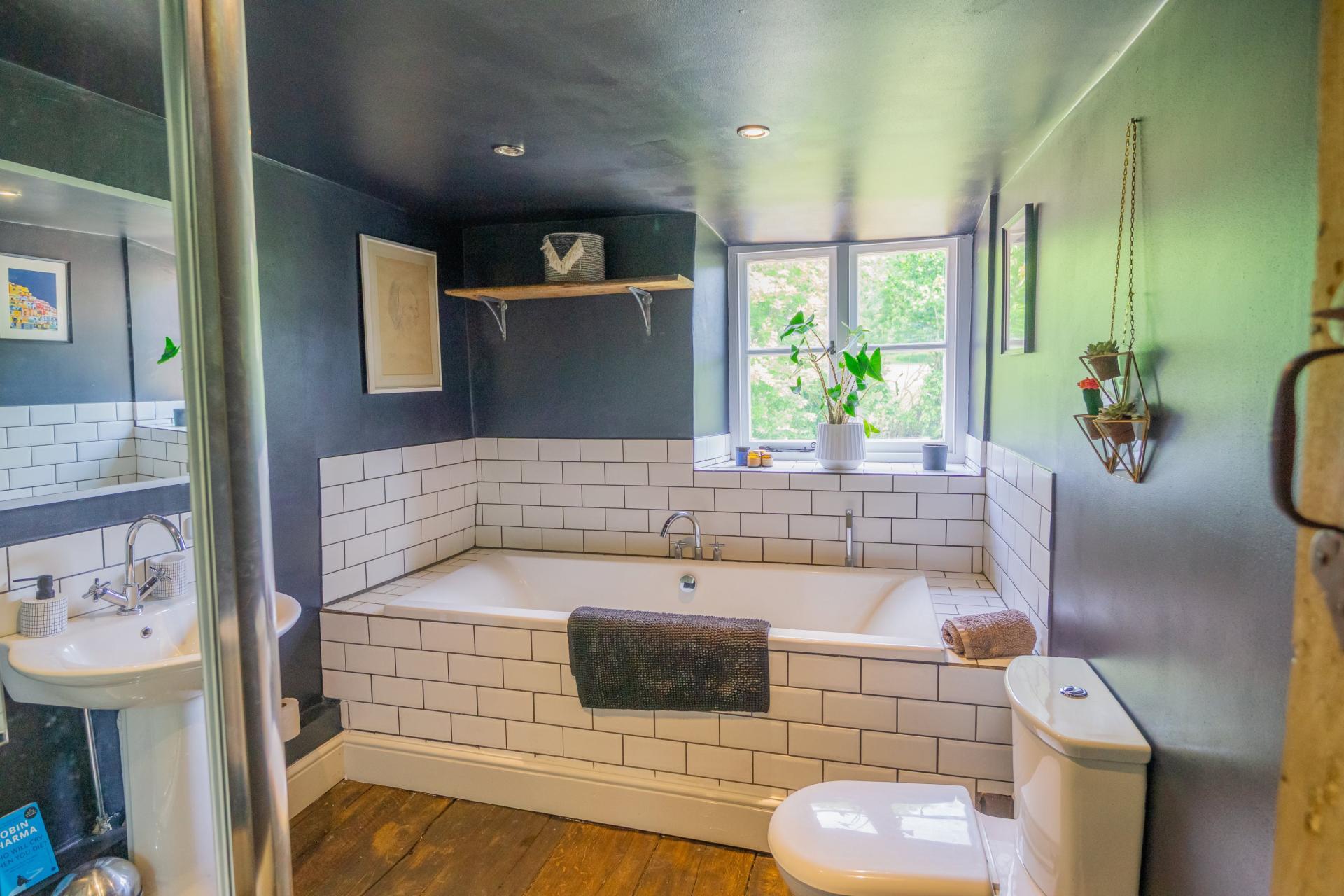 Behind a latched door in the hallway, a beautiful elm staircase leads to the first floor which has been decorated throughout with a selection of Farrow and Ball paints. The principal bedroom decorated with Anna Hayman wallpaper features a charming red brick fireplace, a modern en-suite shower room with a polished concrete finish, and a wonderful outlook across the garden. Two further generously sized bedrooms are also found on this floor, each with its own character, along with a contemporary family bathroom.