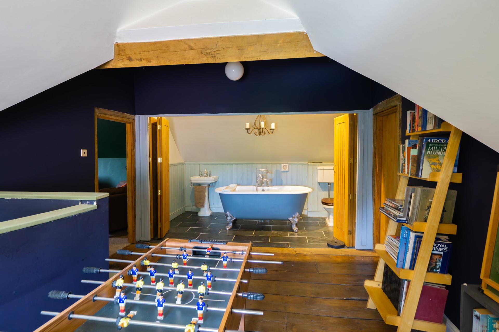 Adjacent to the bathroom is a further door leading to a large space currently configured to support the glamping business, divided into three individual shower rooms and a lounge area. Guests access this space via an external staircase, while an internal connecting door allows access from within the farmhouse if required.