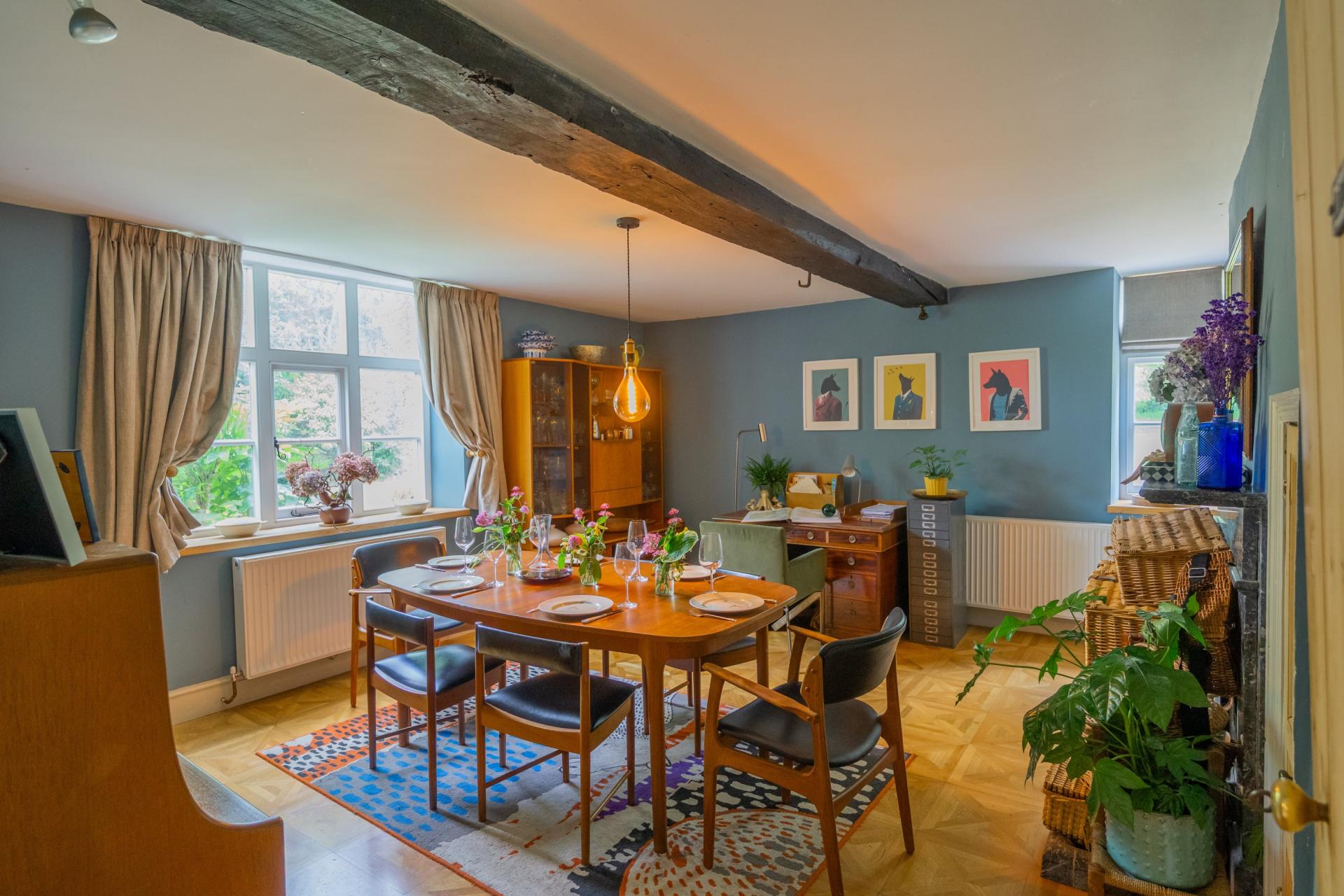 Dursley Cross Farmhouse has been extensively renovated by the current owners over the past decade. Parts of the property date back to the 1600s and 1700s, and it retains many original features including beautiful fireplaces, exposed ceiling beams, timber doors, wide floorboards, and flagstone flooring. Yet it also benefits from modern eco-conscious additions, such as double-glazed windows throughout, comprehensive insulation, and a ground source heat pump.