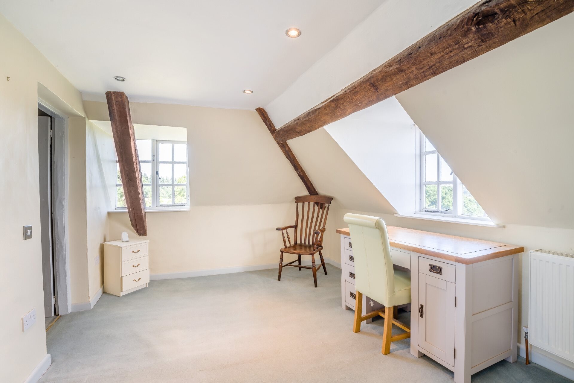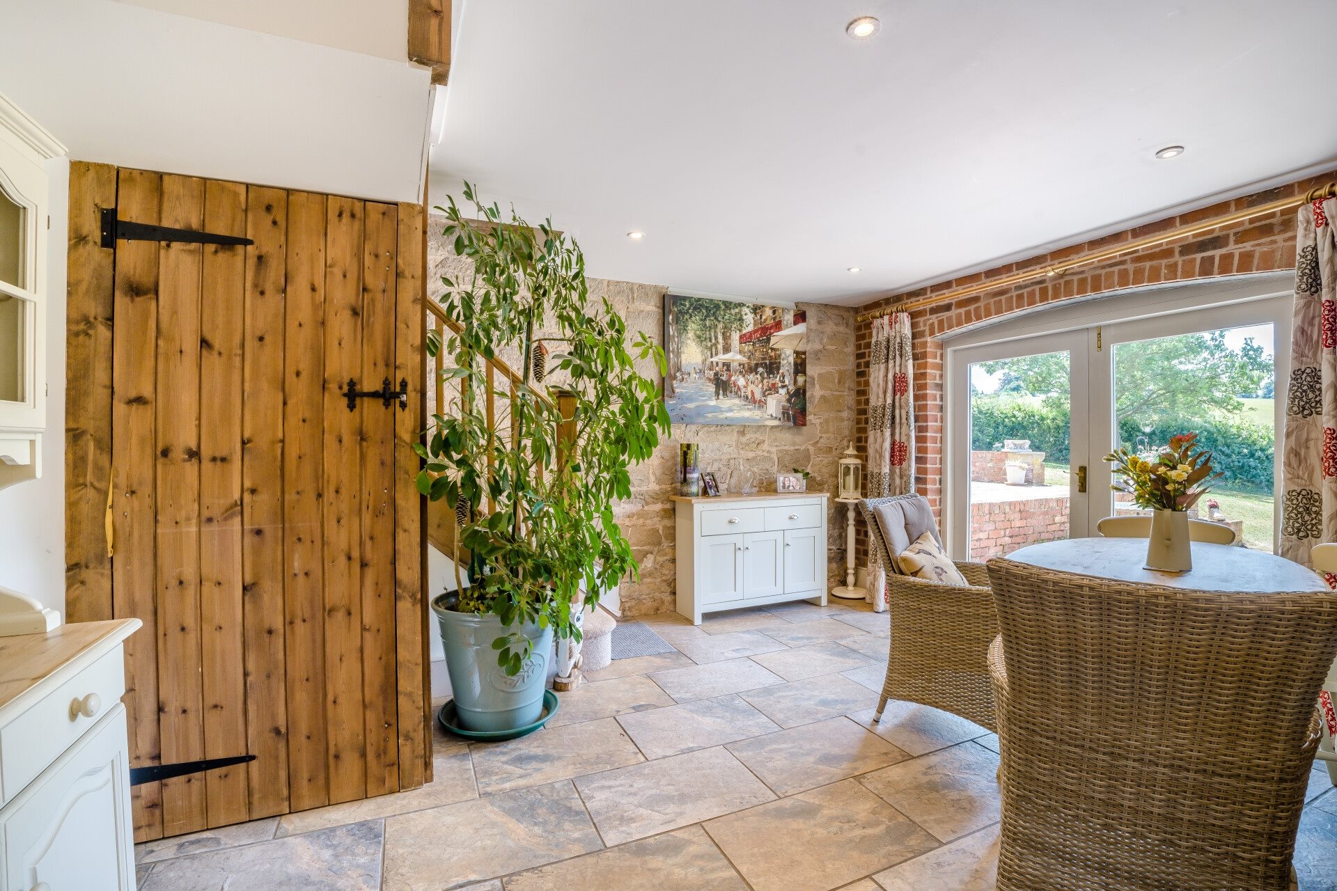 The Granary is linked to the main house via a hallway accessed from both the front and rear. The entrance opens into a spacious kitchen, open plan to a dining area with French doors that frame a view of the garden. Stairs lead up to the first floor, where a light-filled lounge has been positioned to take full advantage of the spectacular views across the garden and surrounding fields.