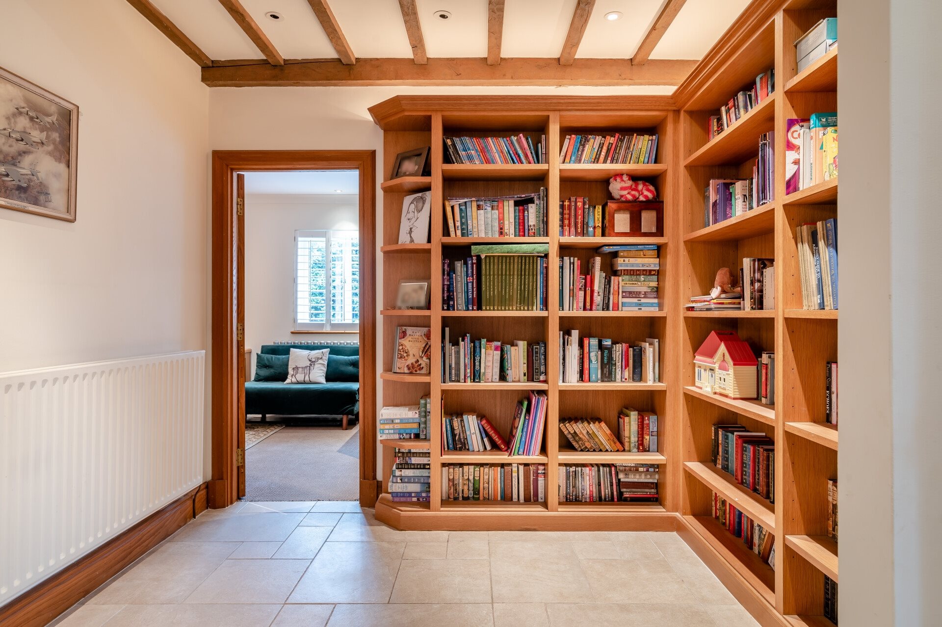 Sympathetically renovated to blend modern luxury with its historic origins, this stunning home retains character features as a nod to its past. A practical entrance porch provides ample space for guests to leave coats and shoes before entering the grand entrance hall and library. This vast, central space, with its vaulted ceiling and elegant staircase, ensures a seamless flow throughout the home. A Lutron lighting system, a state-of-the-art luxury whole-home lighting solution, has been installed. Just off the entrance hall is a home office with bespoke fitted furniture by Mark Wilkinson, as well as a cloakroom.