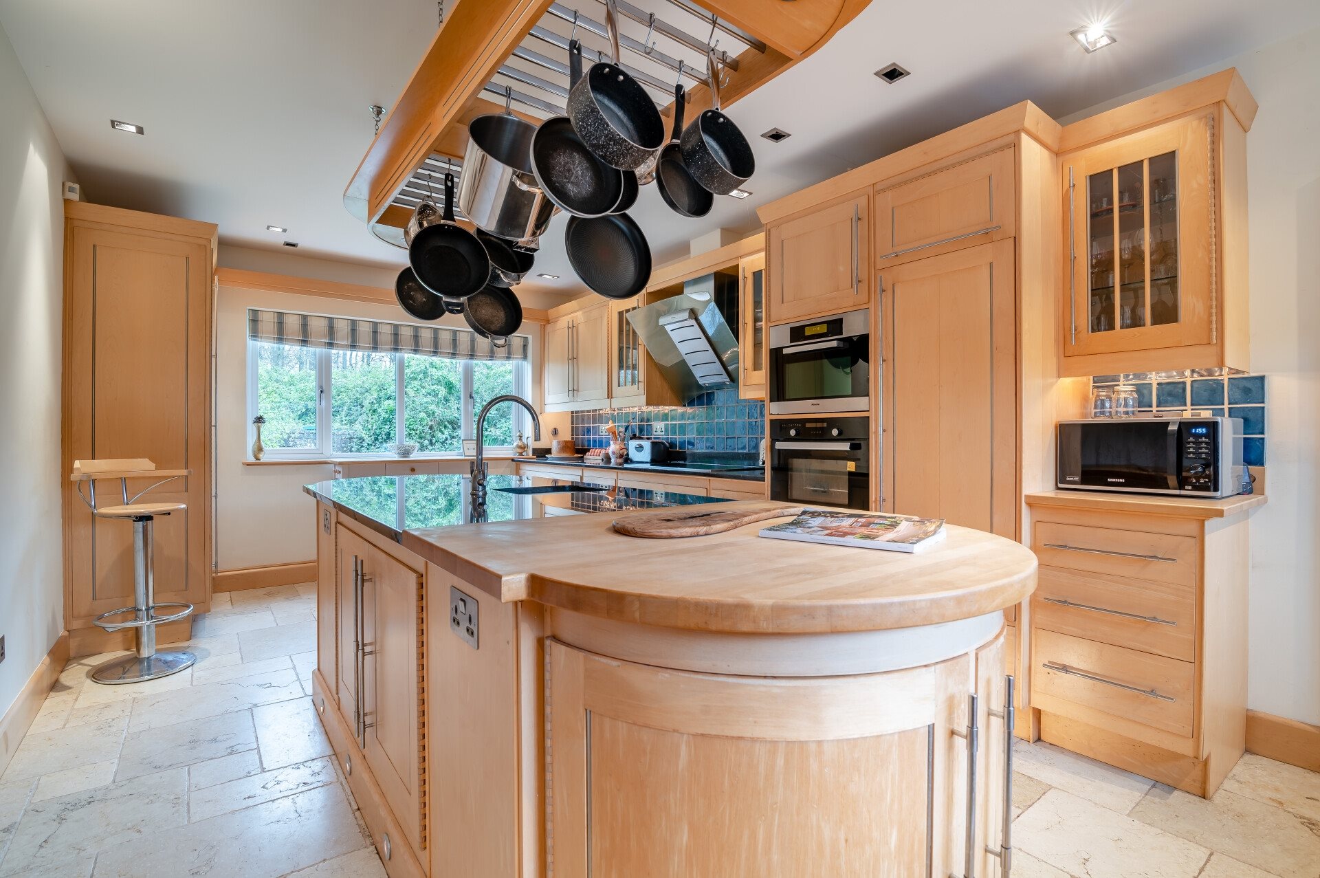 The Mark Wilkinson kitchen is the jewel of the ground floor, blending elegance with functionality. A curved central island, complete with a pot rack above and subtle low-level lighting below, is complemented by floor-to-ceiling cabinetry, including a full larder pantry and integrated appliances. Just off the kitchen, a superb utility room offers ample space to double as a second boot room perfect for everyday use, from muddy boots and pets to unloading shopping while keeping the main entrance pristine for guests."