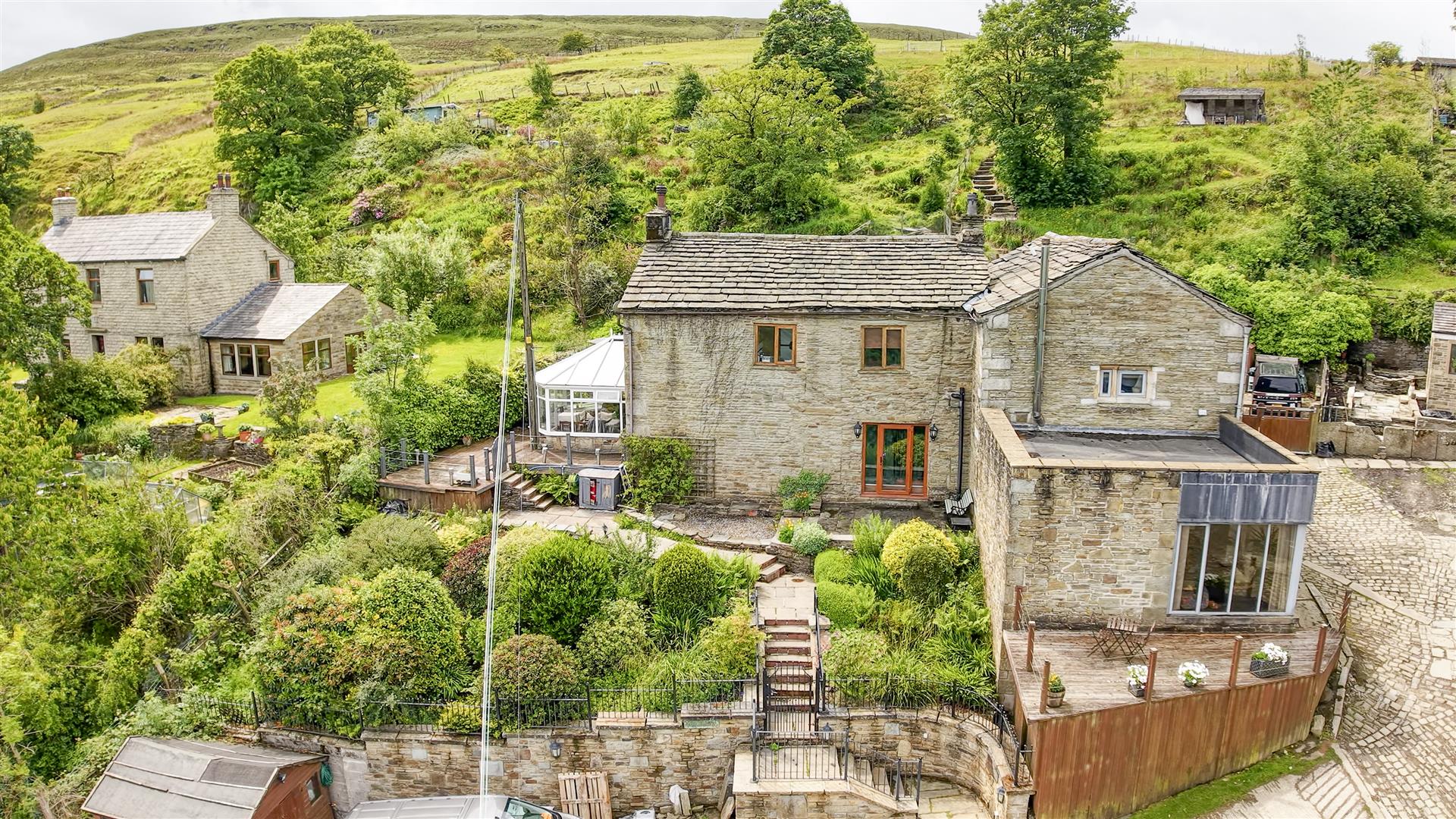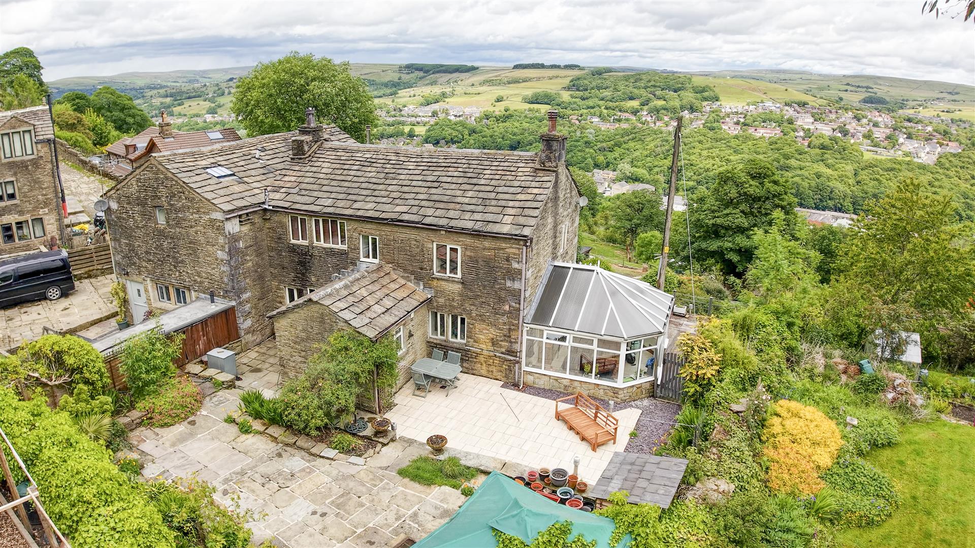 Higher Lench Farm sits in a small hamlet setting at the head of Lench Road and enjoys lovely views out across the Rossendale Valley. Being Grade 2 listed the property has a fabulous character rich feel, including a spacious farmhouse kitchen, feature multi fuel burner, beams and stone features too. The property also has a lovely conservatory, with views and good outdoor space, including patio, deck and garden spaces. Beyond and above this, is a further paddock making the property as a whole, amount to almost 2 acres in all.
