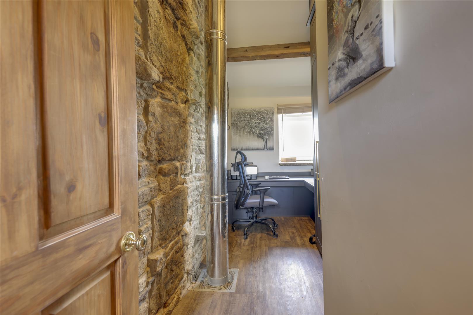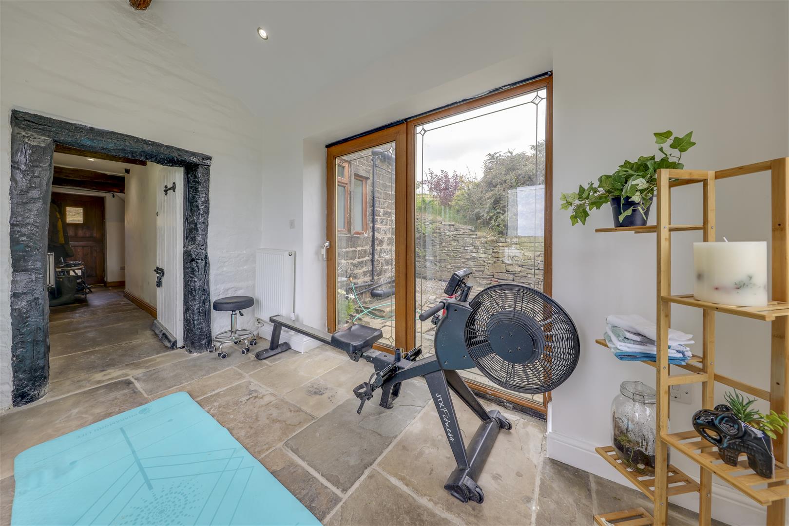 Higher Sunnyfield Farm, Dean, Bacup, Rossendale is a 4 bedroom detached farmhouse, set within a plot of almost an acre, with excellent presentation throughout. Having recently undergone improvement and refurbishment, this property now offers 3 superb bathrooms, a character farmhouse kitchen with a Belfast sink, range cooker and separate electric oven/hob too, separate utility room and downstairs WC, feature woodburner, character beamed ceilings and exposed stone walls and many other appealing features. Currently used as a fitness area, the double-sided glazed study / studio offers expansive views out and would be perfect for a study or other uses too. Outside, there are stone flagged and gravelled patios, with the feature floor finishes continuing inside, through the use of traditional floorboards, stone flags and tiling too.