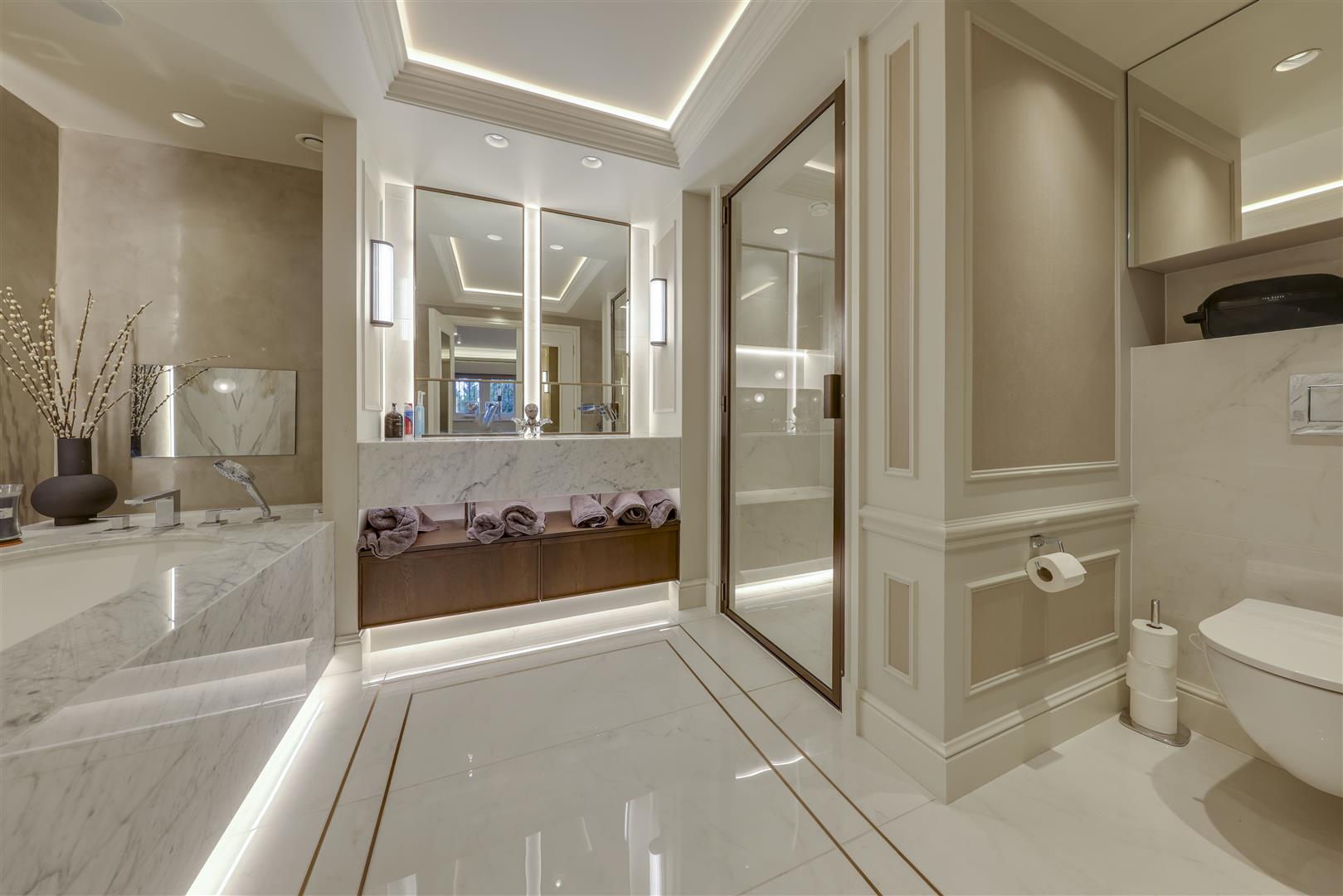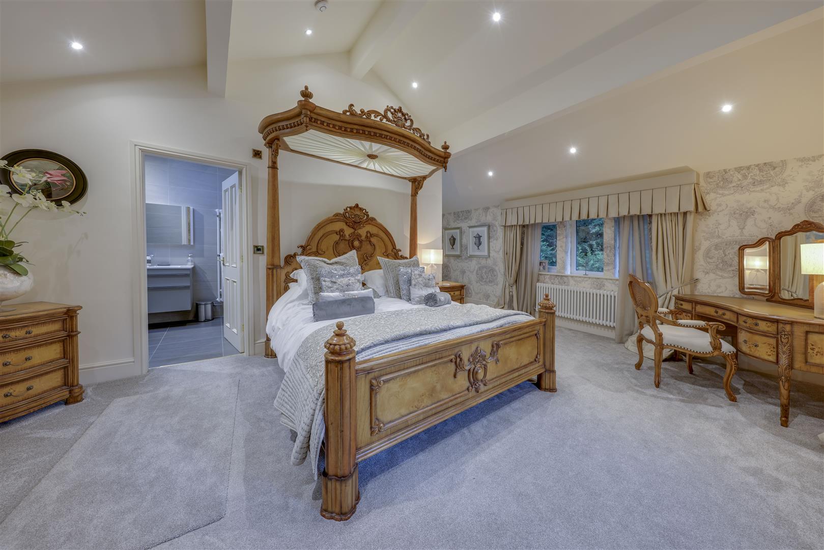 Through glazed aluminium doors, the main lounge is a sumptuous space beautifully styled and with a feature logburner, while the second lounge is a home cinema and a further games room has a fully fitted bar, with bespoke under stairs wine store. Bedroom space is no less well specified, with each of the 6 having en-suite provision, while the Master Suite being finished to an absolutely incredible standard and including separate his & hers dressing rooms, extensive en-suite facilities, ample storage and the hugely impressive spacious bedroom itself. Situated on the ground floor is the leisure complex, inclusive of a beautiful swimming pool with sunroom, fully equipped gym / studio space, changing area, shower room, sauna, covered outdoor hot tub and even a beauty / hair salon with electrochromic glazing and air conditioning.