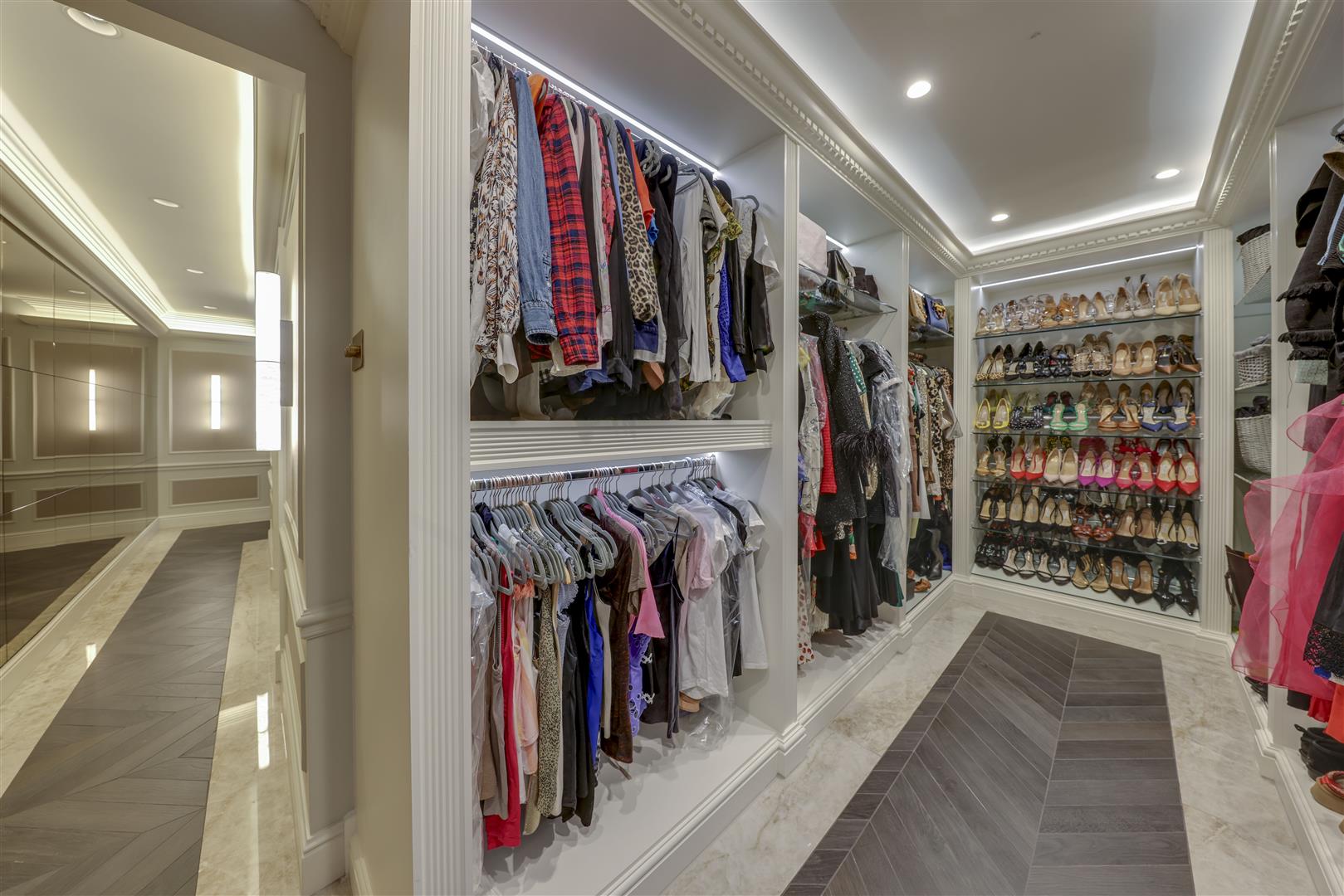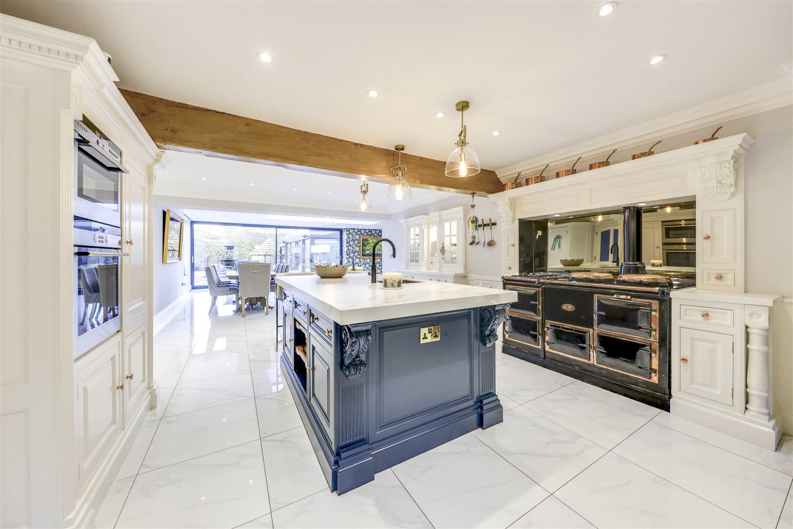 Throughout, the property is generously proportioned and wows from the off, with the impressive entrance hall. There is an exceptional, bespoke fitted kitchen by Clive Christian, with high end integrated appliances, central island, Aga range and large dining / family area with ceiling lantern and sliding doors out to the garden. Perfect for family life or lavish entertaining alike, the formal dining room is also fully fitted with bespoke panelling and furniture too, creating an instant sense of impressiveness for an intimate dining experience, with feature fireplace and chandeliers.