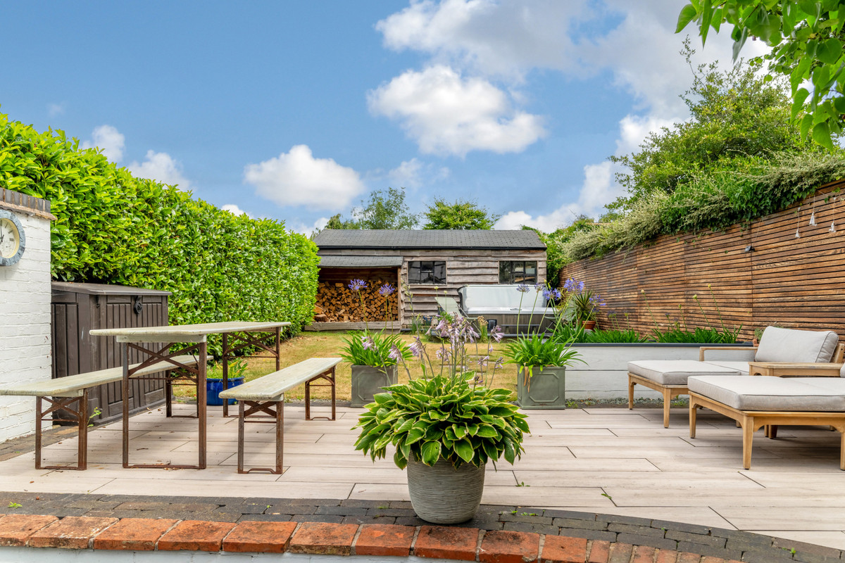 - Landscaped rear garden with hot tub area, raised beds, and seating zones