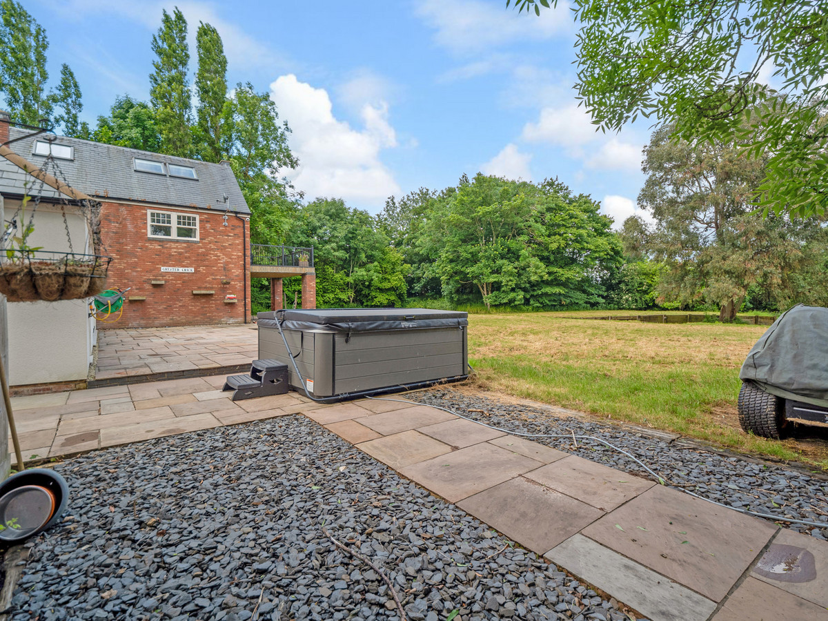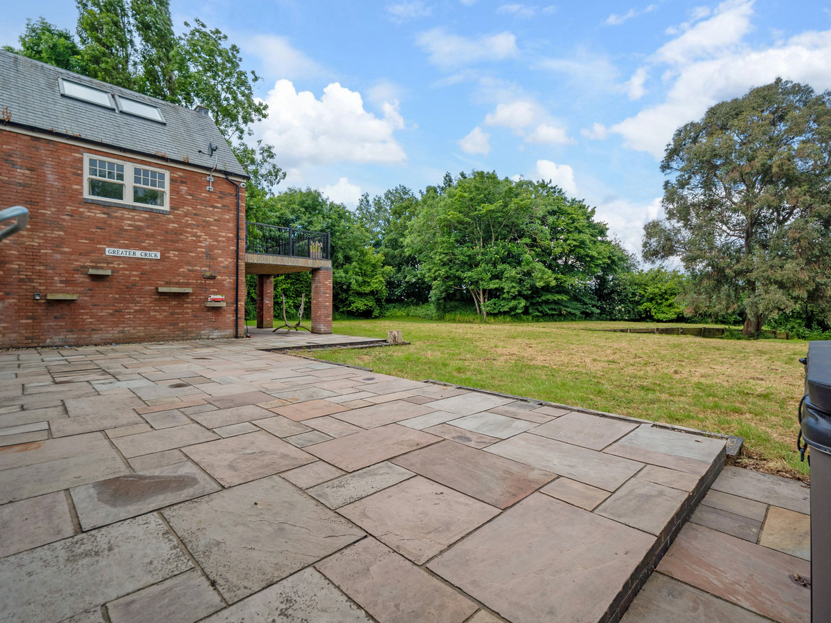 - Beautifully landscaped gardens with a large paved patio, sweeping lawns, mature trees, and a covered seating area