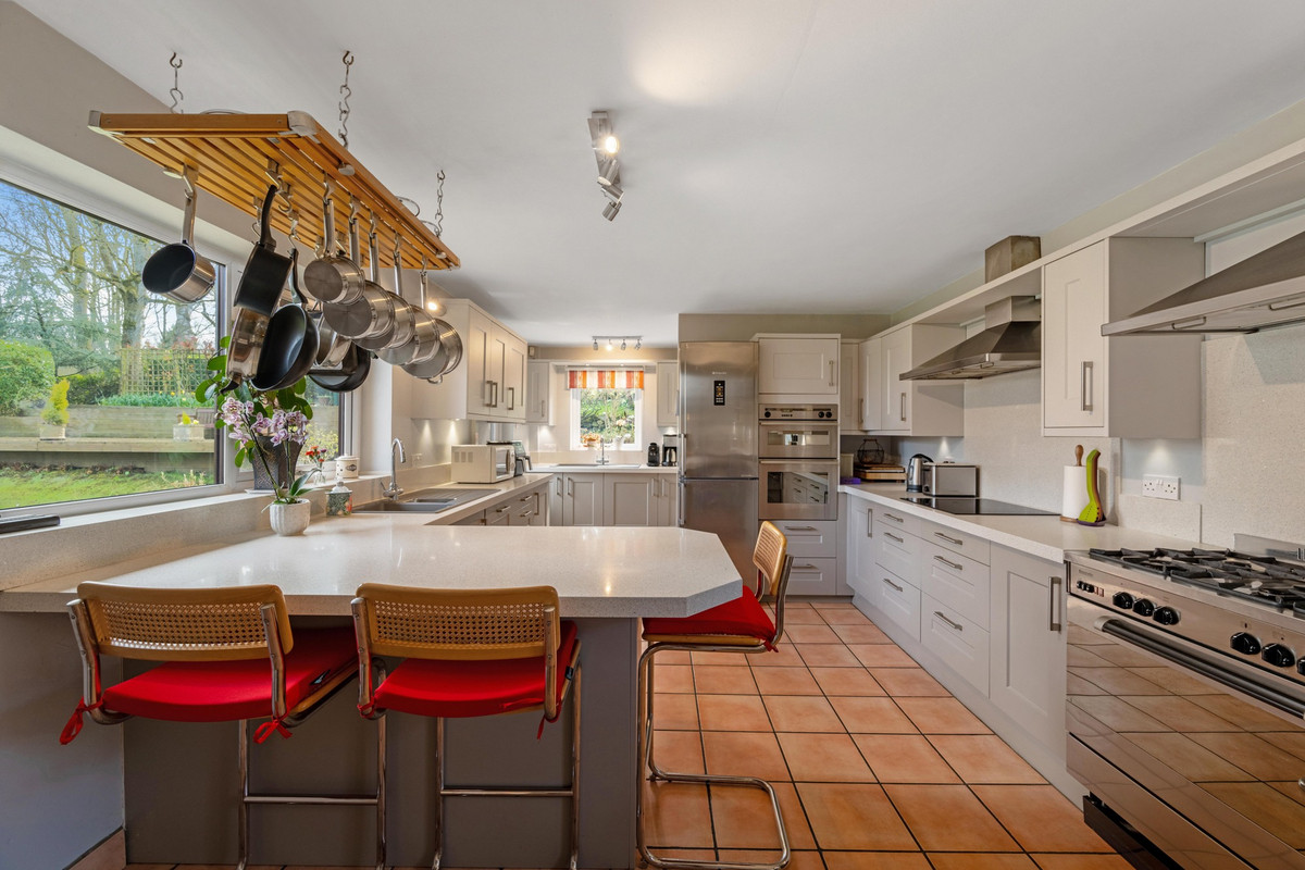 The heart of the home is the re-fitted kitchen/breakfast room, a superbly appointed space featuring sleek high-gloss cabinetry, granite work surfaces, and a full range of integrated appliances, including a six-hob range cooker and an induction hob with a double oven. A granite breakfast bar provides the perfect spot for morning coffee, while the utility area adds practical convenience with an additional sink and a walk-in pantry/storage cupboard.