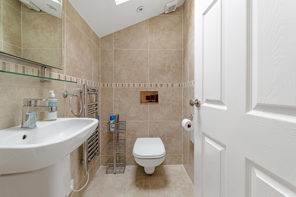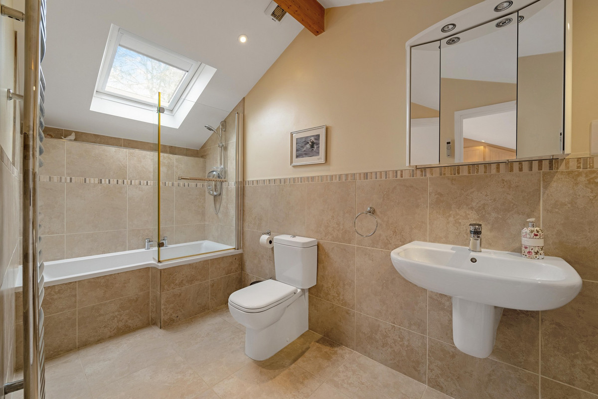 Upstairs, the principal suite is a true retreat, complete with fitted wardrobes, a dedicated dressing room, and a private en-suite shower room. The second bedroom forms part of the extension, boasting an impressive, vaulted ceiling, a private balcony, built-in wardrobes, and an en-suite bathroom with a Velux window. Bedroom three benefits from a private en-suite cloakroom, while bedroom four enjoys charming garden views. A well-appointed family bathroom completes the first floor.