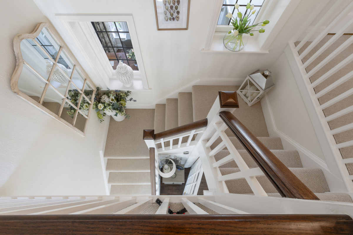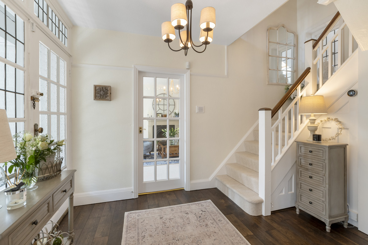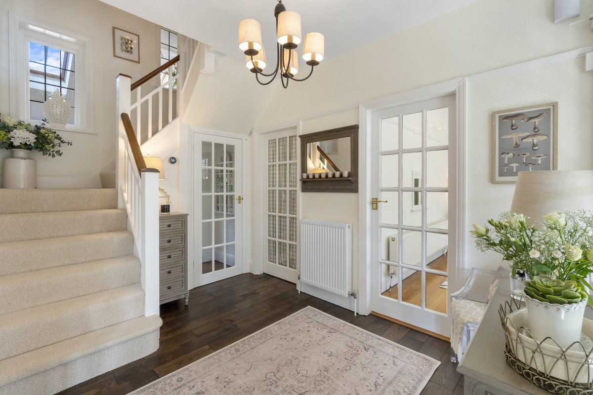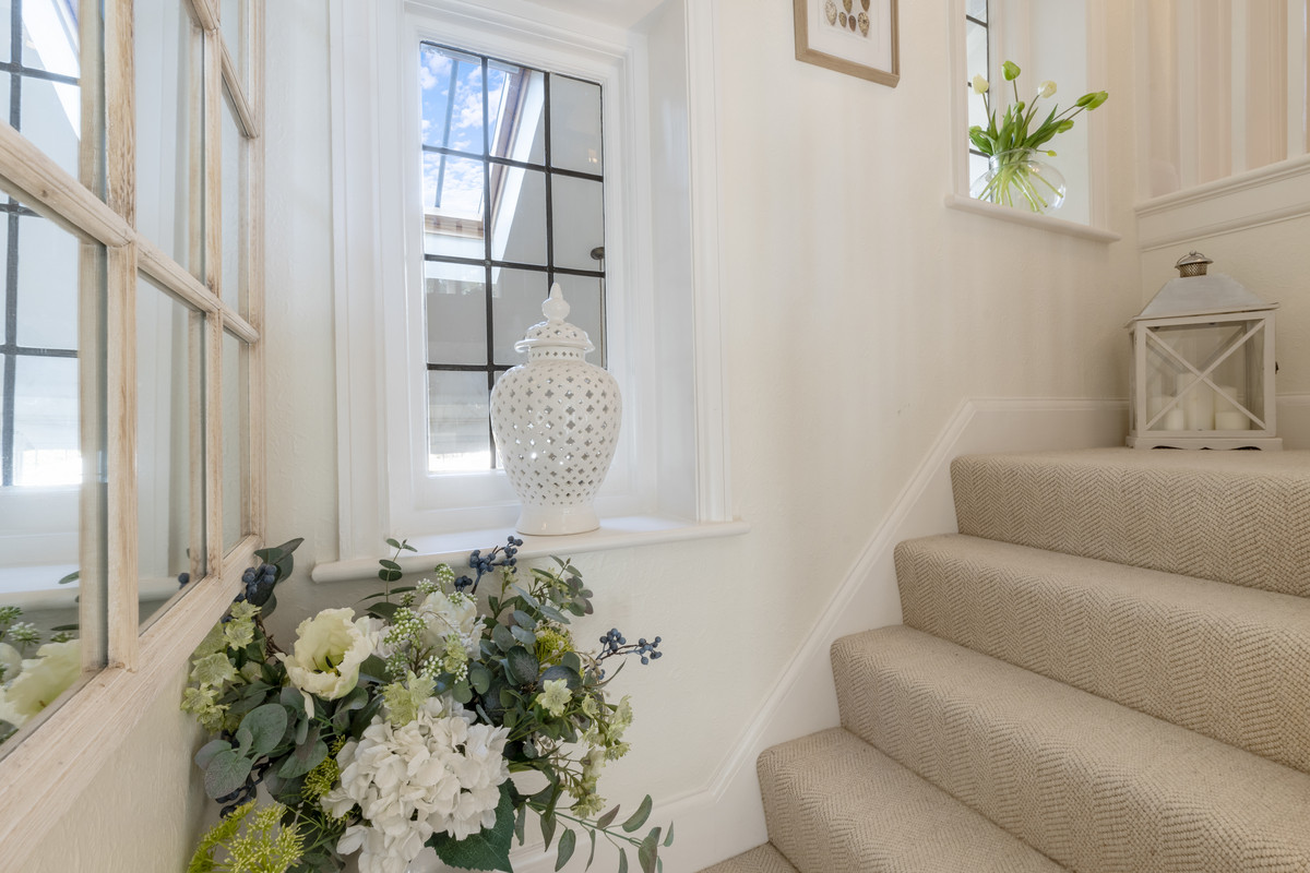 Stepping through the front porch you are welcomed by a generous entrance hall with natural wood tones and soft light. It sets the stage for the home’s inviting feel somewhere warm and homely, yet undeniably elegant. A beautiful staircase rises to the first floor with two leaded windows the perfect place to display your favourite things.