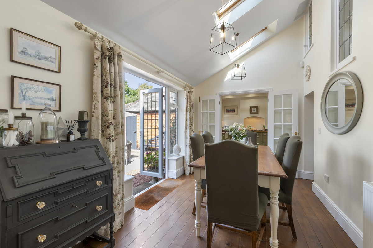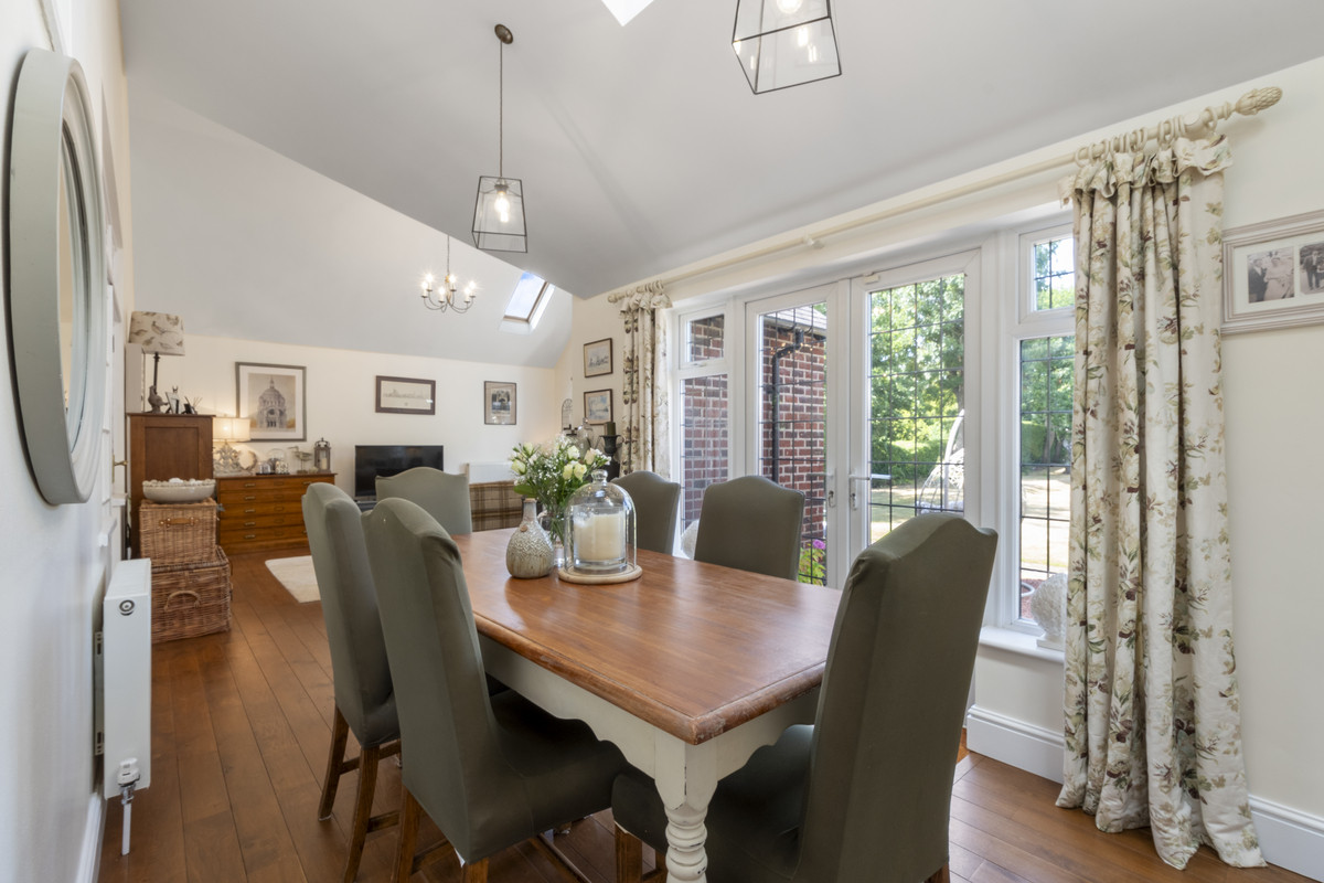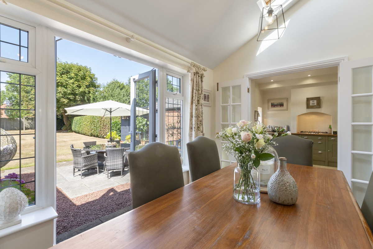The dining and living areas flow naturally towards the garden, with two sets of double doors opening to the patio/garden, bringing the outside in.
