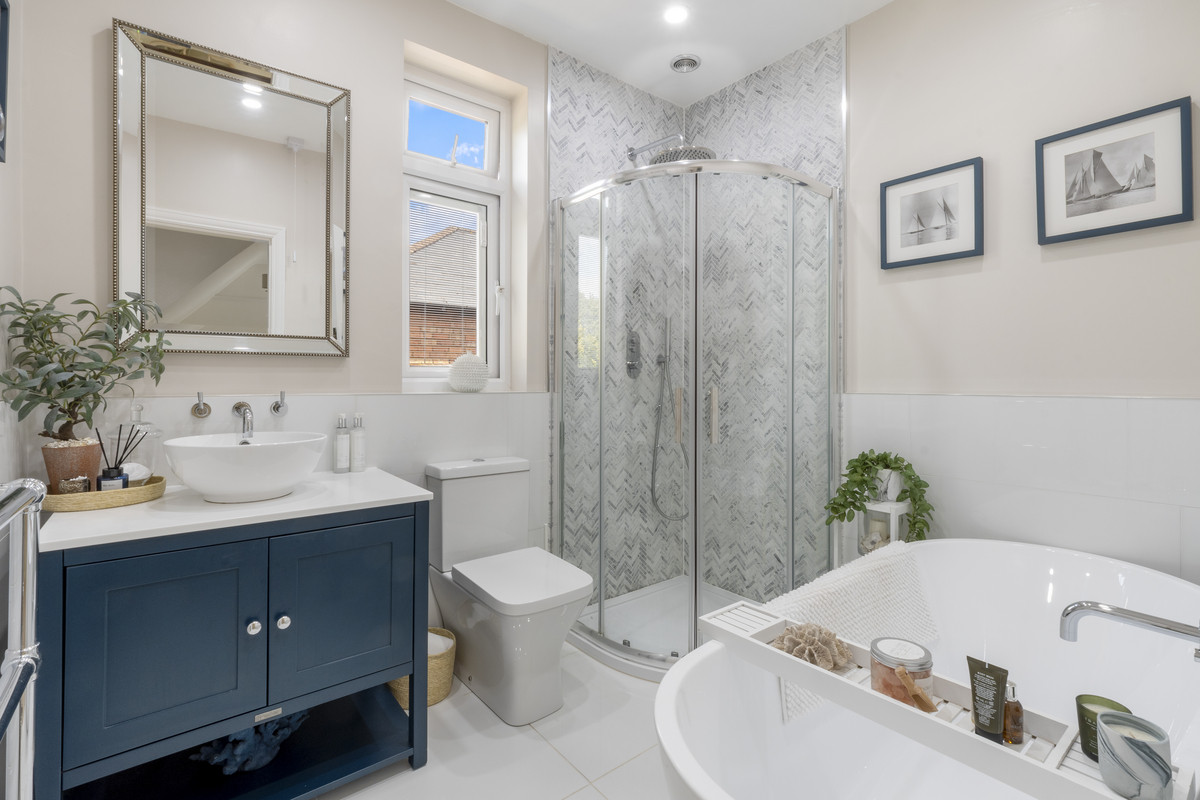 Stylish and practical, the main bathroom is well-appointed with underfloor heating and a contemporary suite, comprising a shower, bath WC and cabinet with sink above.