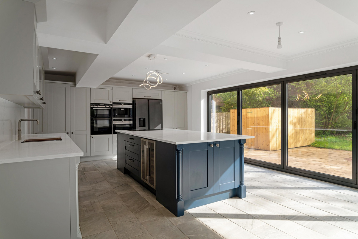 At the heart of the home is a stunning, high-specification kitchen, beautifully appointed with a deep-blue island, sleek grey cabinetry, and Siemens appliances including a double oven, induction hob with integrated extractor, coffee machine, and dual wine coolers. Bathed in natural light from anthracite bi-fold doors, this space is perfectly designed for both everyday living and entertaining, flowing effortlessly into the dining and living areas with further bi-folds opening to the rear garden.