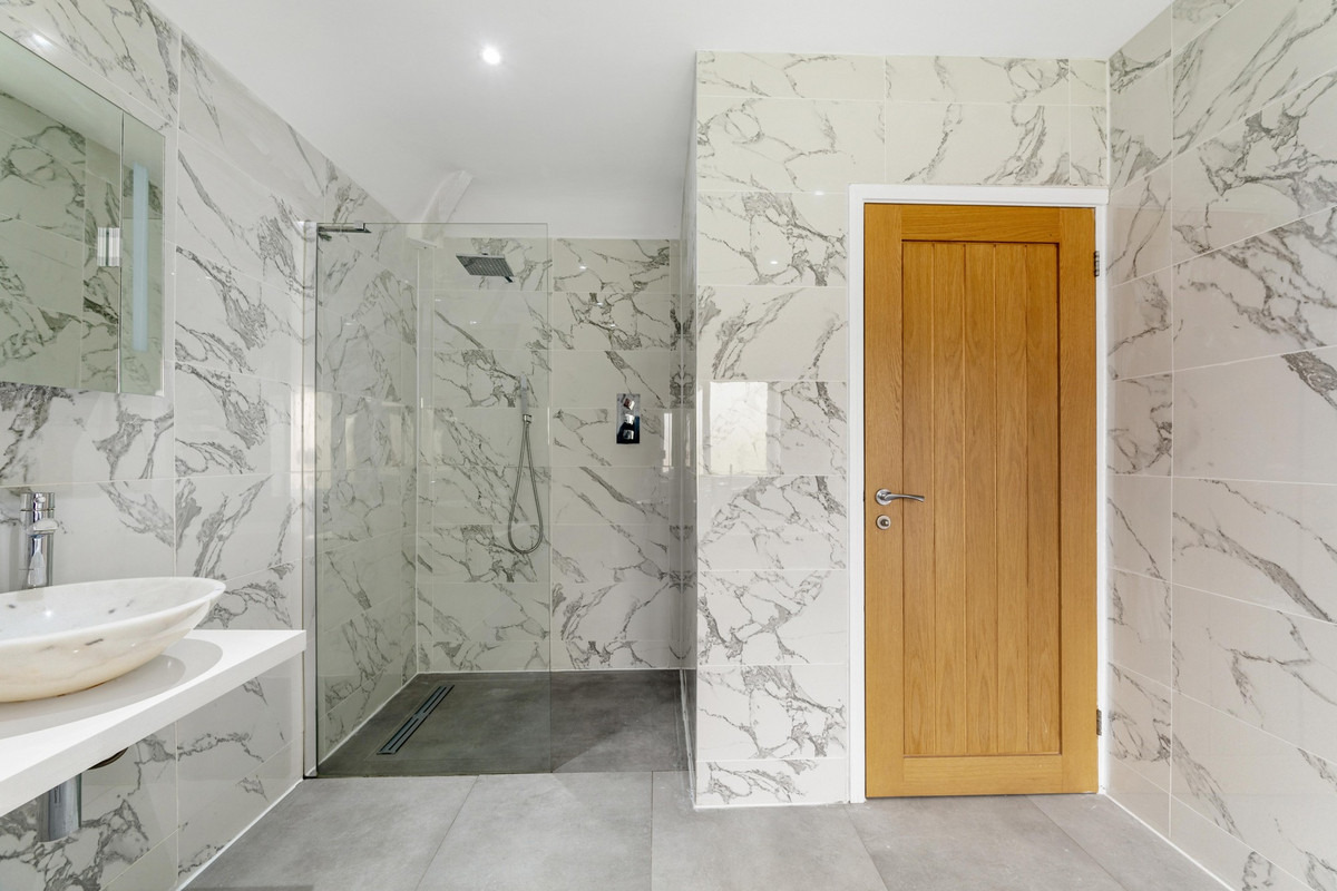 The lounge exudes sophistication with large, water-effect porcelain tiles, inset spotlights, and underfloor heating, while a stylish study offers the ideal work-from-home space, finished with wood-effect porcelain tiles and oak doors.