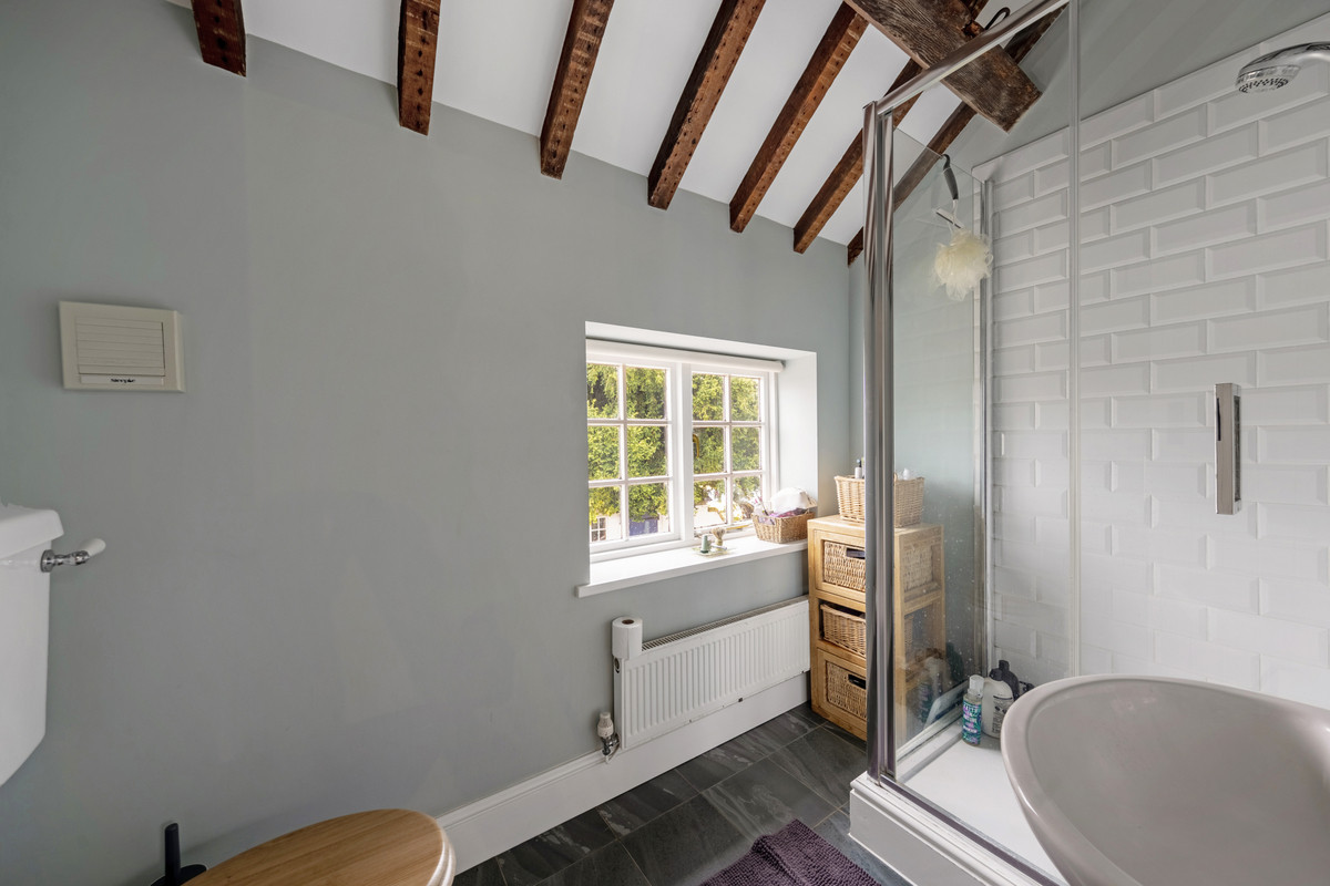 Upstairs, the main bedroom is a relaxing sanctuary with vaulted ceilings and exposed beams, a dressing area, and en-suite. Three more double bedrooms, a family bathroom and additional shower room offer ample space for family and guests. The second floor reveals another bedroom and two attic rooms, perfect for hobbies or storage.