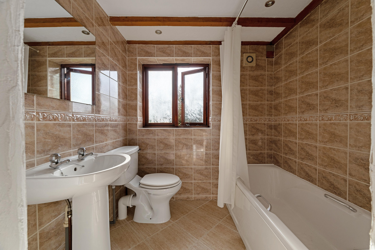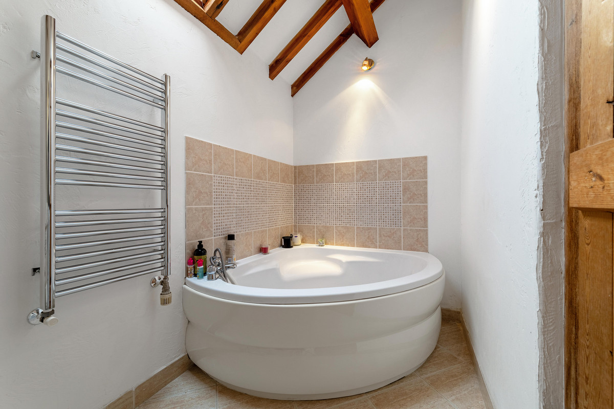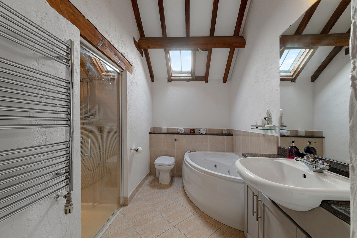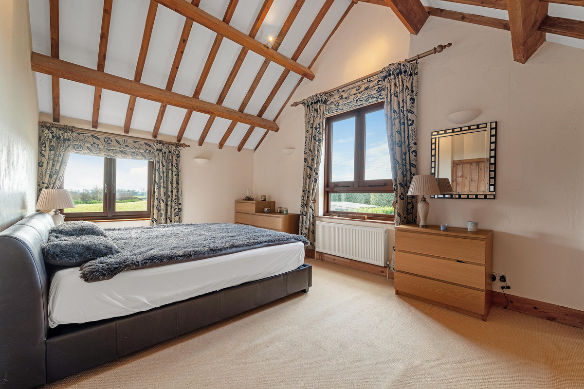 The galleried landing overlooks the large sitting room below and has a variety of exposed ceiling timbers and storage areas. Bedroom one has a dual aspect with views of the frontage and side gardens, a vaulted ceiling, two built-in double wardrobes and access to an ensuite bathroom with whirlpool style bath, separate shower cubicle, wash basin with cabinetry and enclosed WC. Neighbouring this is bedroom three, which also has views to the front and a vaulted ceiling, wardrobe and an ensuite shower room. Bedroom four shares similar features and a view to the side. At the rear of the barn is bedroom five which is opposite the family bathroom, whilst bedroom two is a large double bedroom with vaulted ceiling, views of the side gardens and its own ensuite shower room.