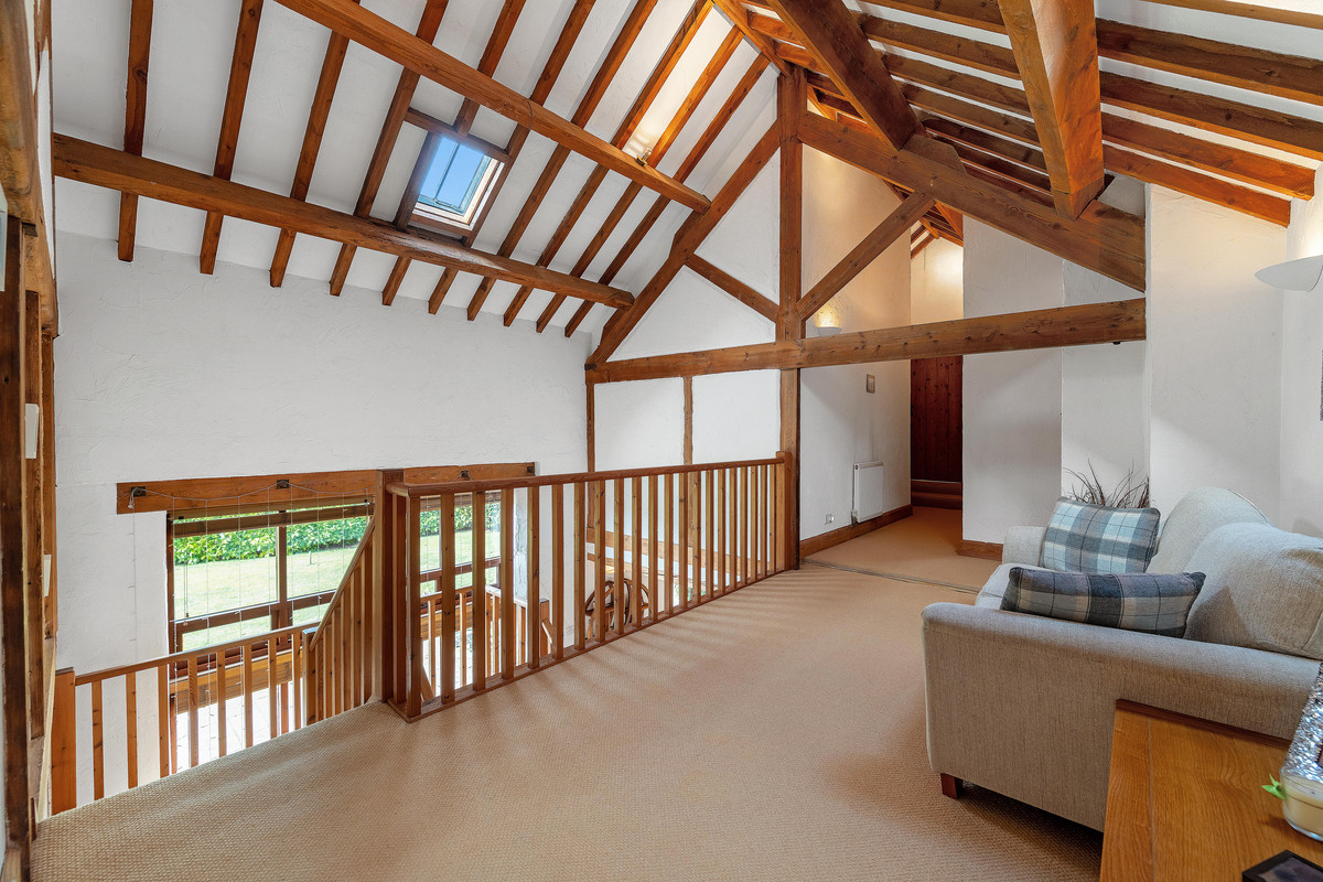 The Granary has an attractive entrance hall with full length glazing overlooking the frontage, access to the cloakroom, exposed ceiling timbers and latched doors that lead off to the generous accommodation, including the utility room and kitchen/dining room. To one end of the barn is a large executive study with access to the garden by French doors and views across the frontage. There is a second study adjacent to the main study and a large open plan sitting room with a gorgeous open fireplace and a staircase that leads to a galleried landing, plus French doors that lead to the rear gardens. This leads on to the games room, which has access to both the side and rear gardens. The kitchen dining room has great views of the frontage, attractive tiled floor with underfloor heating, and a variety of bespoke cabinets including an island unit and a range of built-in appliances. The kitchen enjoys a vaulted ceiling with exposed timbers, views of the rear garden and French doors with a step to the rear terrace. A convenient ground floor bedroom exists at this end of the barn with its own private access, views of the frontage, an ensuite bathroom and a vaulted ceiling; perfect for an independent relative or guests.