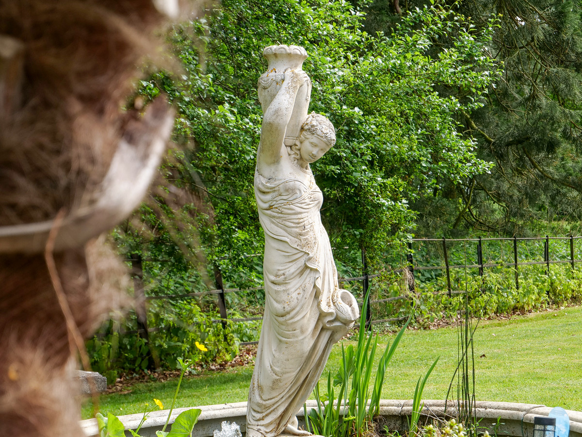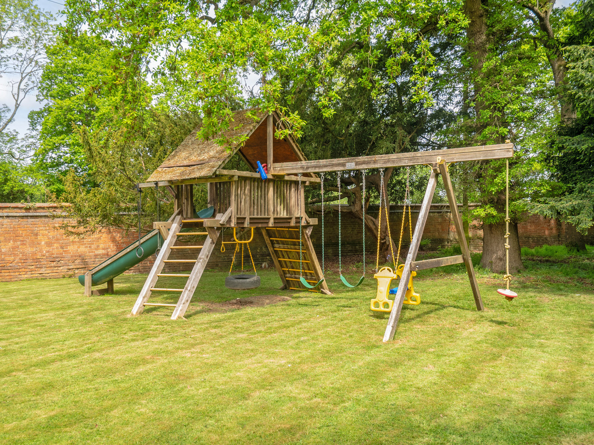 Lawn area wrapping around the rear of the home, patio area, and ornamental pond. There is a large adventure climbing frame for children. Perfect for those who love the outdoors, with south-facing gardens.