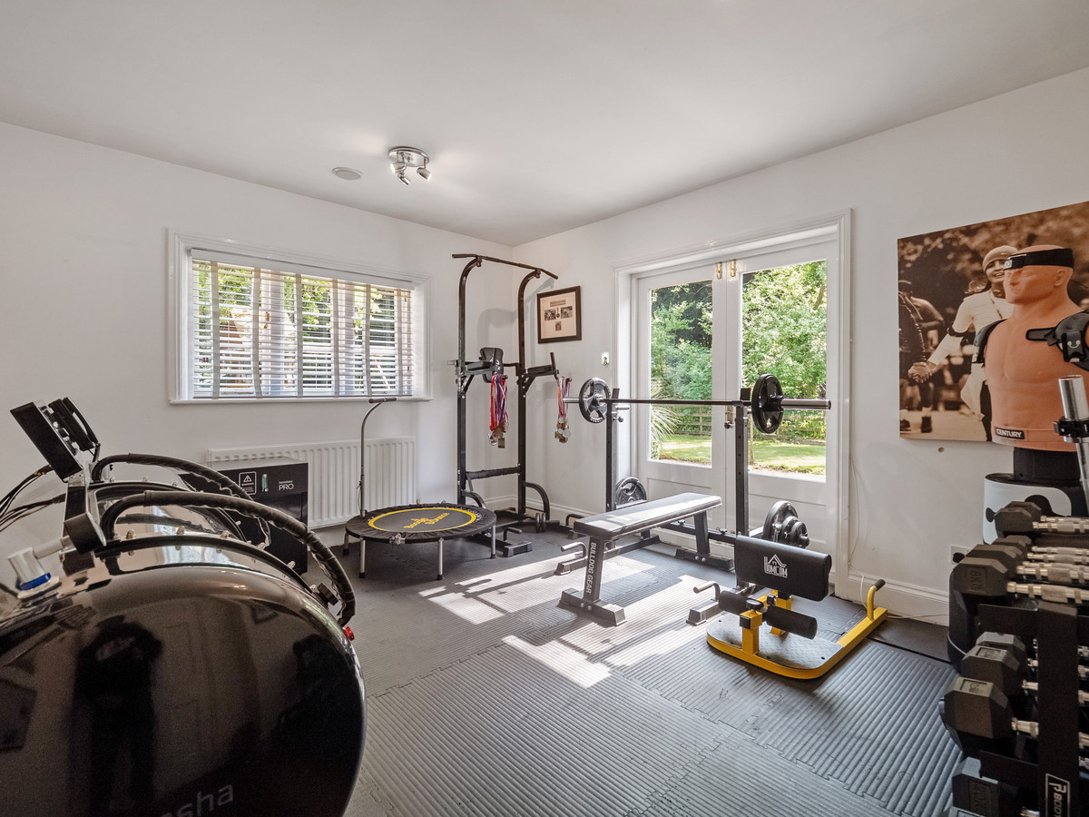 The kitchen has an island and an additional dining area. From this kitchen, you can access a utility room, a downstairs cloakroom, and a gym/games room