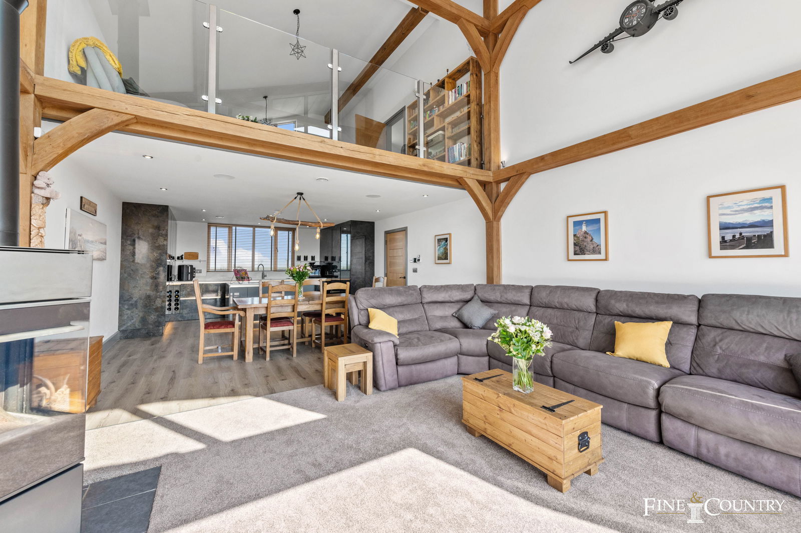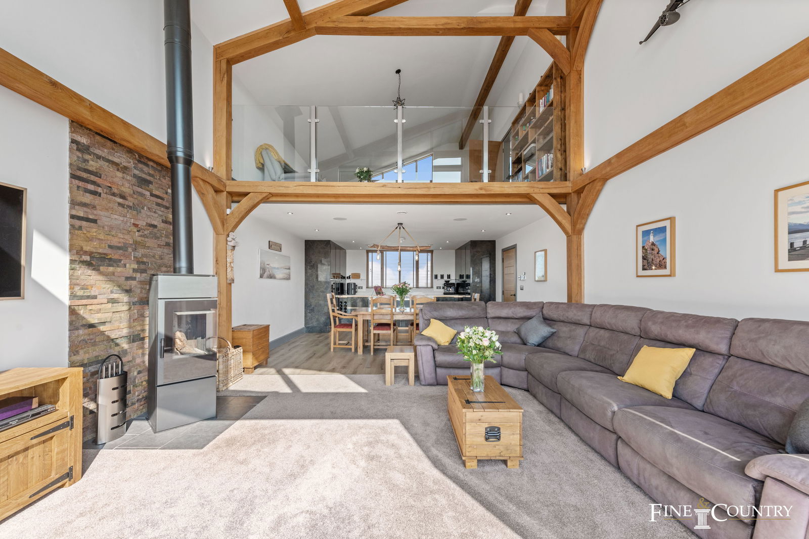The open plan living area on the first floor letting in plenty of natural light. The kitchen is well fitted, with a Miele induction cooker hob and downdraft extractor, Quooker flex tap, plentiful cupboard space and a central island, whilst the seating area benefits from a modern log burner, double height ceiling and bi-fold doors that lead out onto the balcony. On this floor there is also a fantastic bedroom with double height ceiling and French doors with access to the balcony and fitted with built-in cupboards. Adjacent to the bedroom is a contemporary bathroom. Ascending to the second floor you will find a mezzanine style space that is currently used as a study but would be ideal as a bedroom.