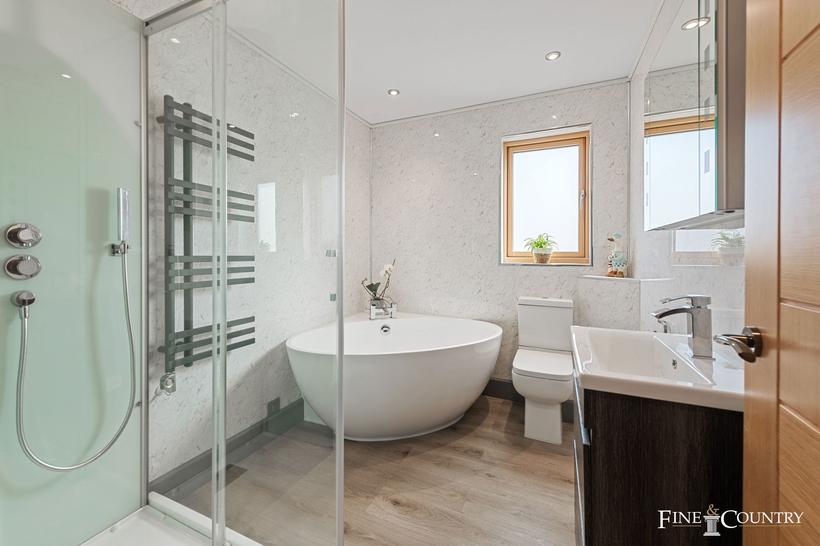 The property also benefits both eco-friendly and budget friendly aspects: - the house is heated by integral heap pump ventilation (HPV) air source unit, which also uses the heat in the air being extracted from the property through mechanical ventilation with heat recovery (MVHR). This means there is an economical, clean and filtered warm air supply, which can also be reversed for cool air in the summer. The elegant heating system – supported by twelve solar panels at the back of the garden, with fifteen-kilowatt storage batteries in the shed – combines with aluminium clad, pine framed triple glazed windows to ensure warmth through the colder months. The close attention paid to the windows, centrepieces in their own right, is finished off with Hillary’s made to measure blinds, and solar powered electric blinds on the lounge’s rear upper windows. Meanwhile, power is returned to the grid in the autumn, spring and summer.