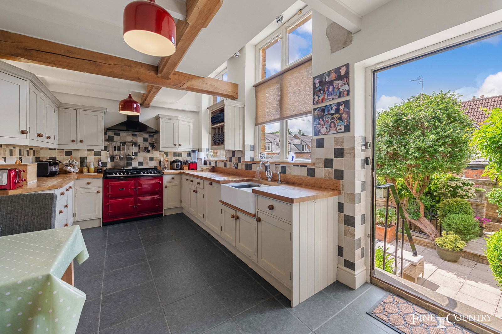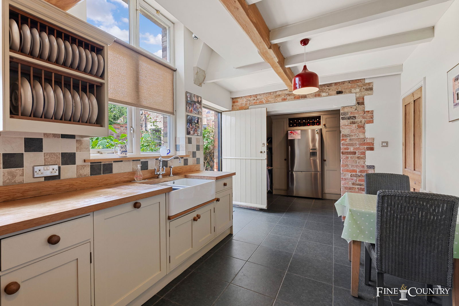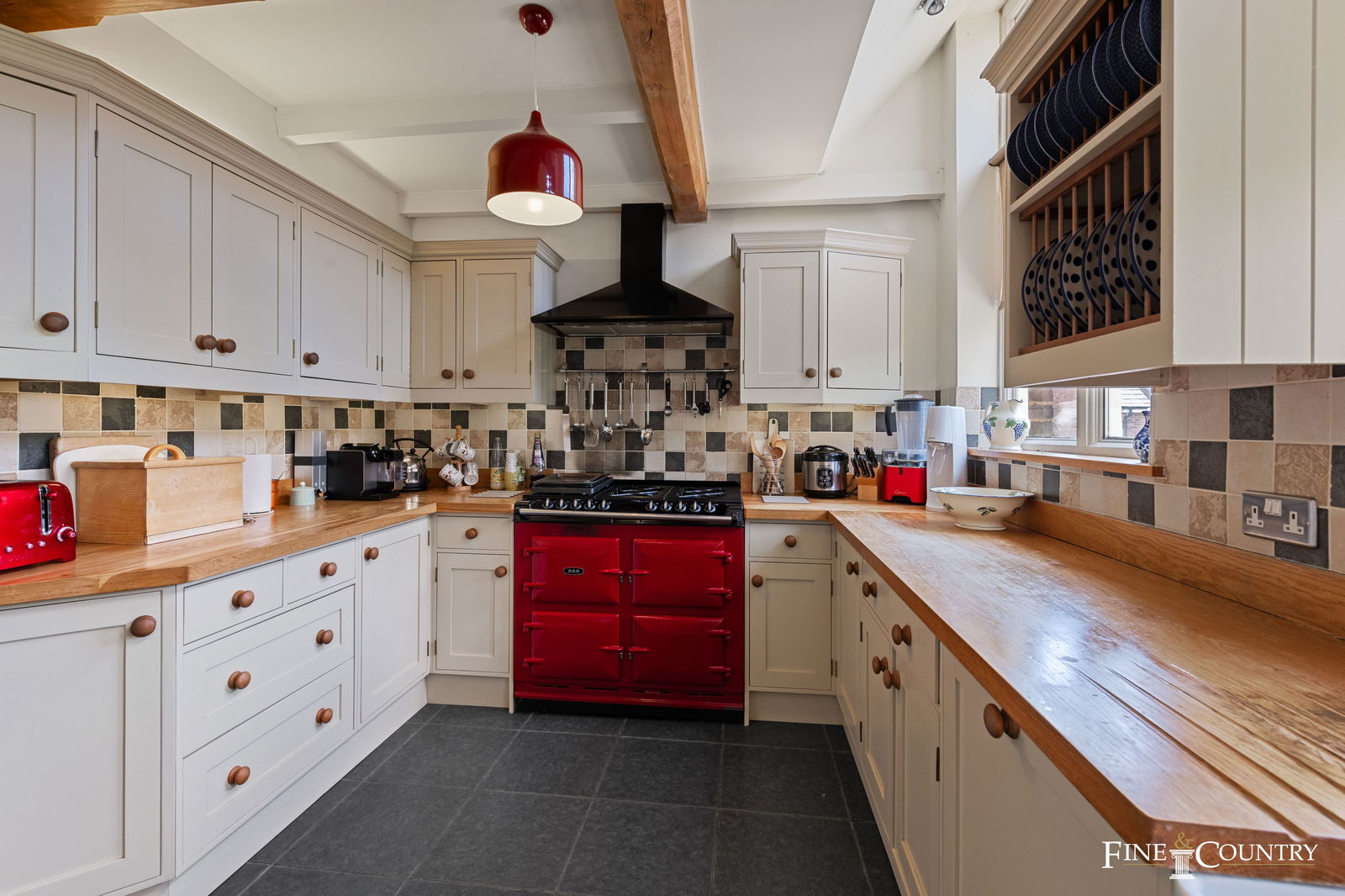 The kitchen is accessed from the dining room and includes an Aga (available by separate negotiation), ample cabinetry, and a practical utility section with laundry facilities and additional storage. A breakfast table fits comfortably for those more relaxed days, and a door leads directly out to the garden, connecting the indoor space to the multi-level courtyard garden.