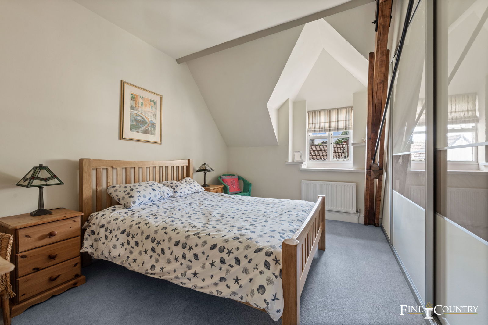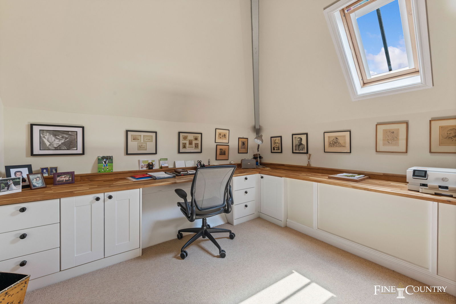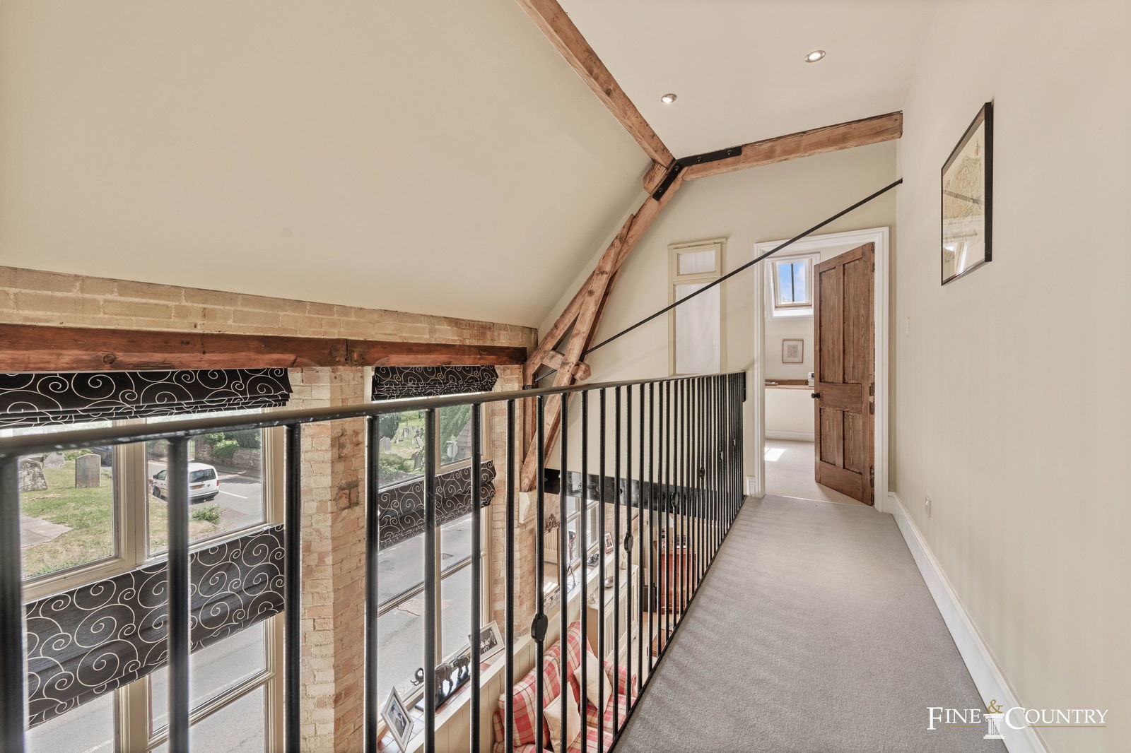 Upstairs, three bedrooms are arranged along the galleried landing. The principal suite includes fitted wardrobes and a spacious en-suite shower room with a generous Grohe monsoon shower. A second double bedroom also offers built-in storage and exposed beams. The third bedroom, currently used as a study, is well sized and versatile, with an internal window that provides a quirky link down to the reception space below. Also on this level is a family bathroom with bath, basin and WC, and an additional separate shower room. A deep linen cupboard completes the upstairs layout.
