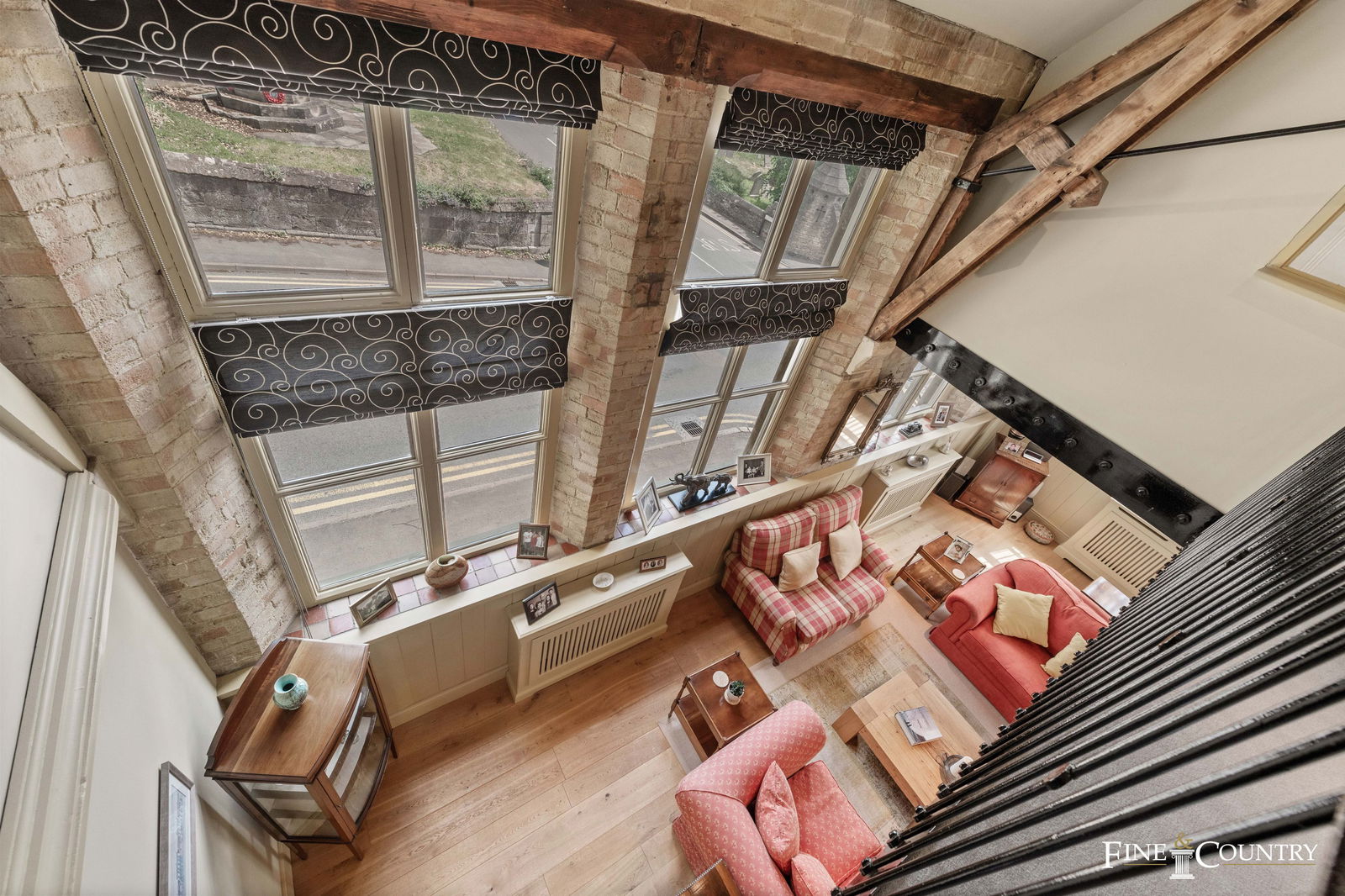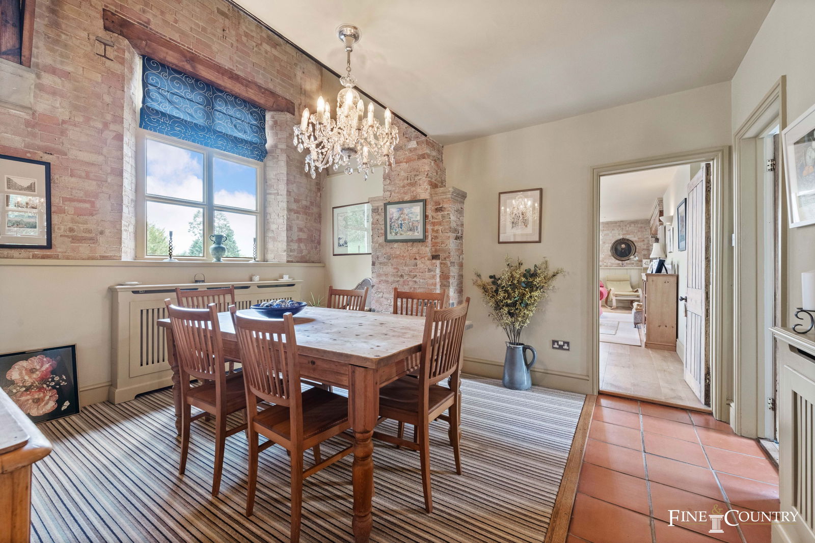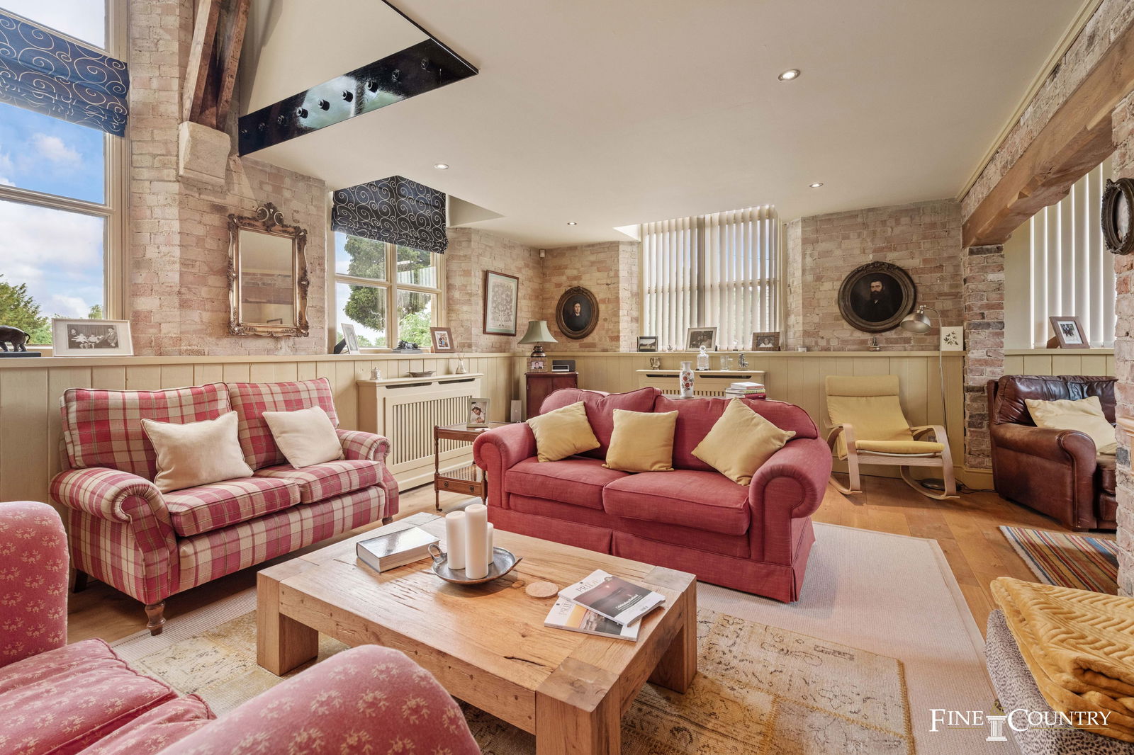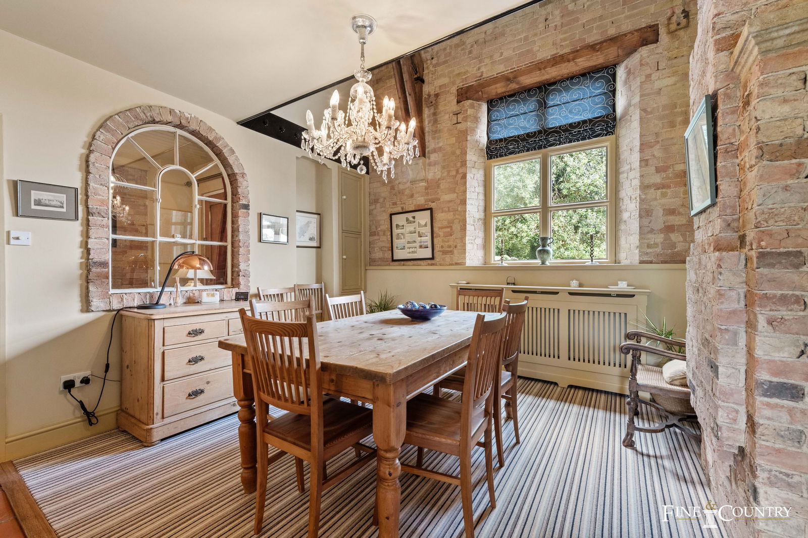 The dining room and adjacent L-shaped sitting room form the heart of the home. Both benefit from double-height ceilings with a gallery above and large windows that bring in an impressive amount of natural light. Exposed beams add warmth and structure, while visible steel struts on the upper level introduce a distinctive industrial detail that works beautifully with the building’s original fabric. The snug area of the sitting room offers a relaxed corner for everyday use while remaining part of the open plan layout.