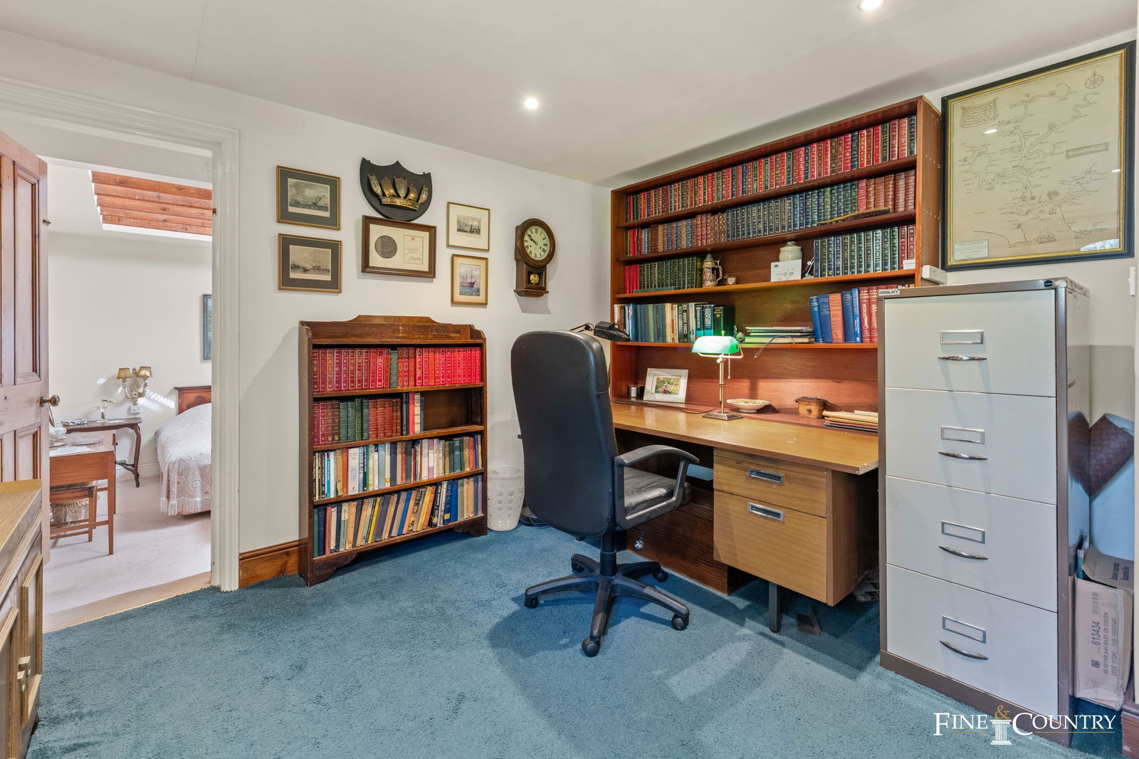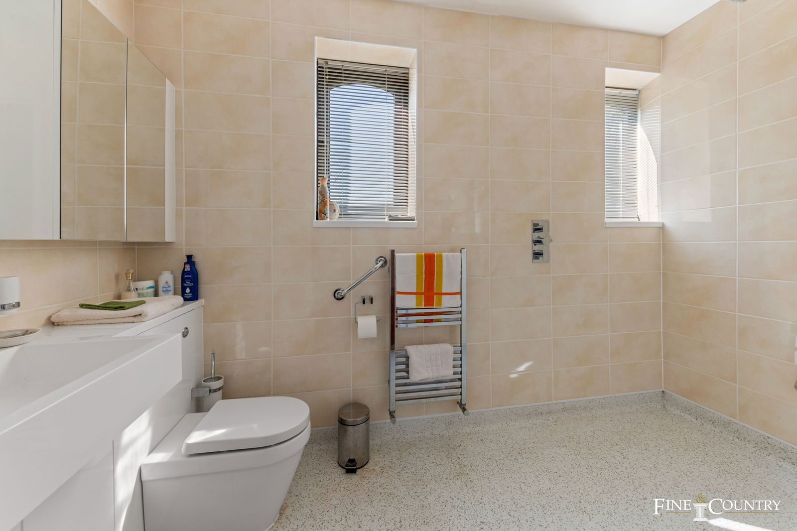 The principal bedroom suite is particularly generous, comprising a spacious double bedroom, dressing area and large en-suite shower room. Two further bedrooms are located nearby, both doubles, one en-suite the other with a dedicated shower room, providing flexibility for family living or guest accommodation. Additionally, there are three further rooms currently used as studies but easily adaptable to further bedrooms if desired. This adaptability is reflected across the property, which could readily evolve to suit the changing needs of a growing family, those seeking multi-generational living, or simply purchasers requiring ample room to work from home.