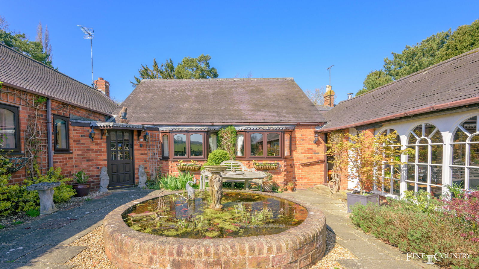 The layout of the property is centred around a charming central south facing courtyard with a water feature, providing a beautiful outlook from several rooms and a calming heart to the home. The main reception room is a lovely space, enjoying dual aspects and views towards the garden, while the kitchen and dining room sit adjacent, offering practical and sociable spaces with doors that flow naturally to the courtyard outside. The kitchen itself, fitted in a classic style, is both practical and characterful, with a bay window looking onto the courtyard and fields beyond.