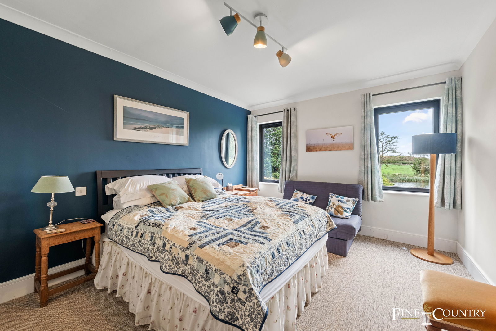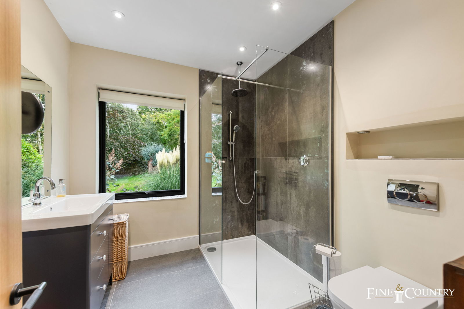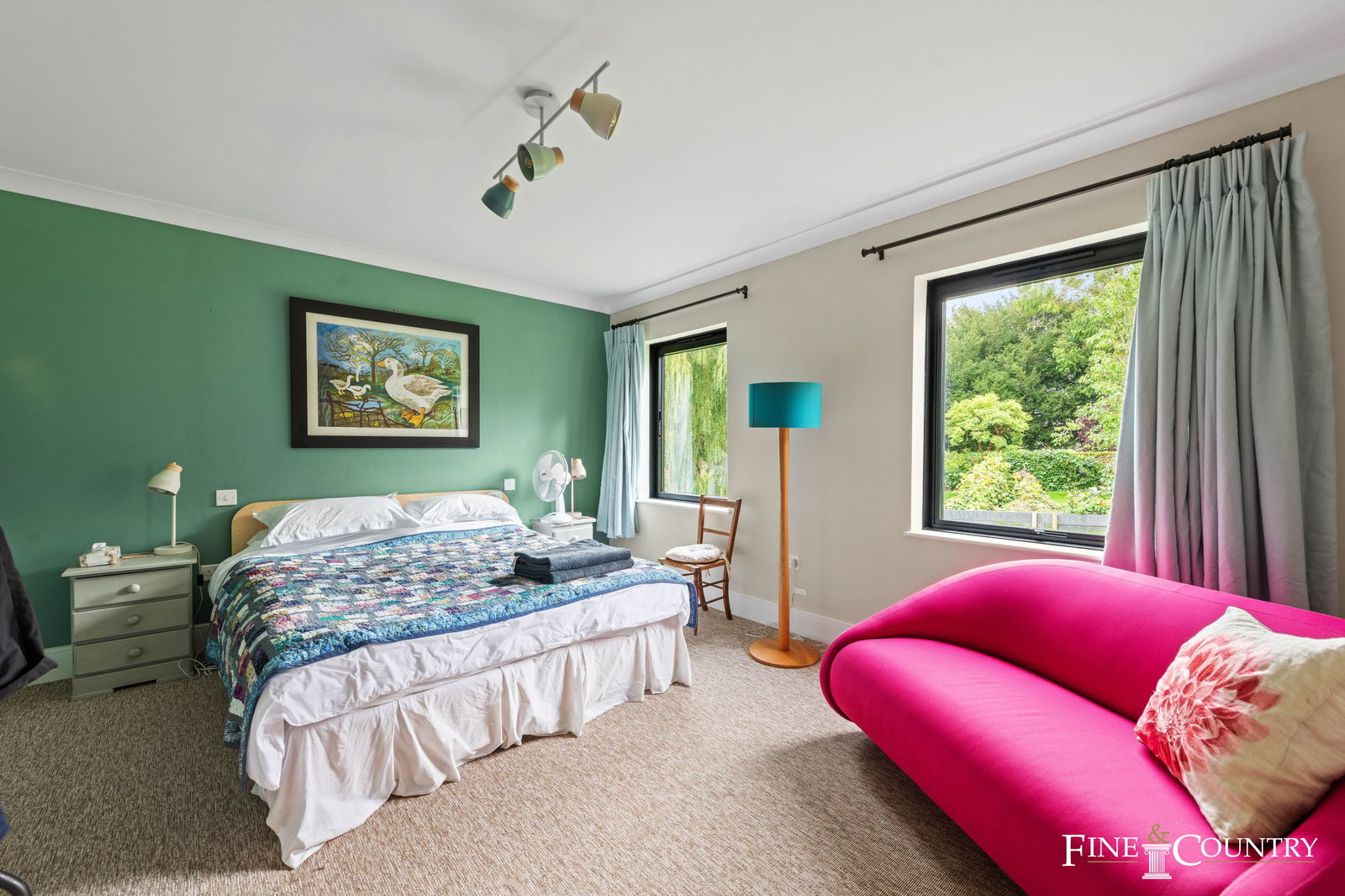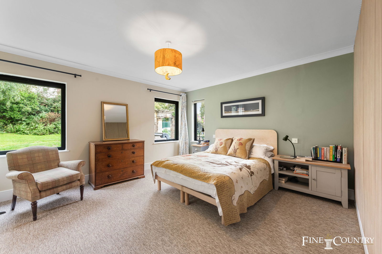 The accommodation is cleverly arranged, with the main living areas positioned to maximise views, while the bedroom wing offers privacy and calm. The master suite is generous in scale, boasting not only two bathrooms but also two dressing rooms—rarely found in homes of this era and offering a truly luxurious lifestyle. Three further bedrooms, including two well-proportioned guest rooms and a smaller bedroom or study, provide versatility for families or visiting friends. A stylish additional bathroom, cloakroom, and guest WC—each with views of the garden or lake—complete the wing.
