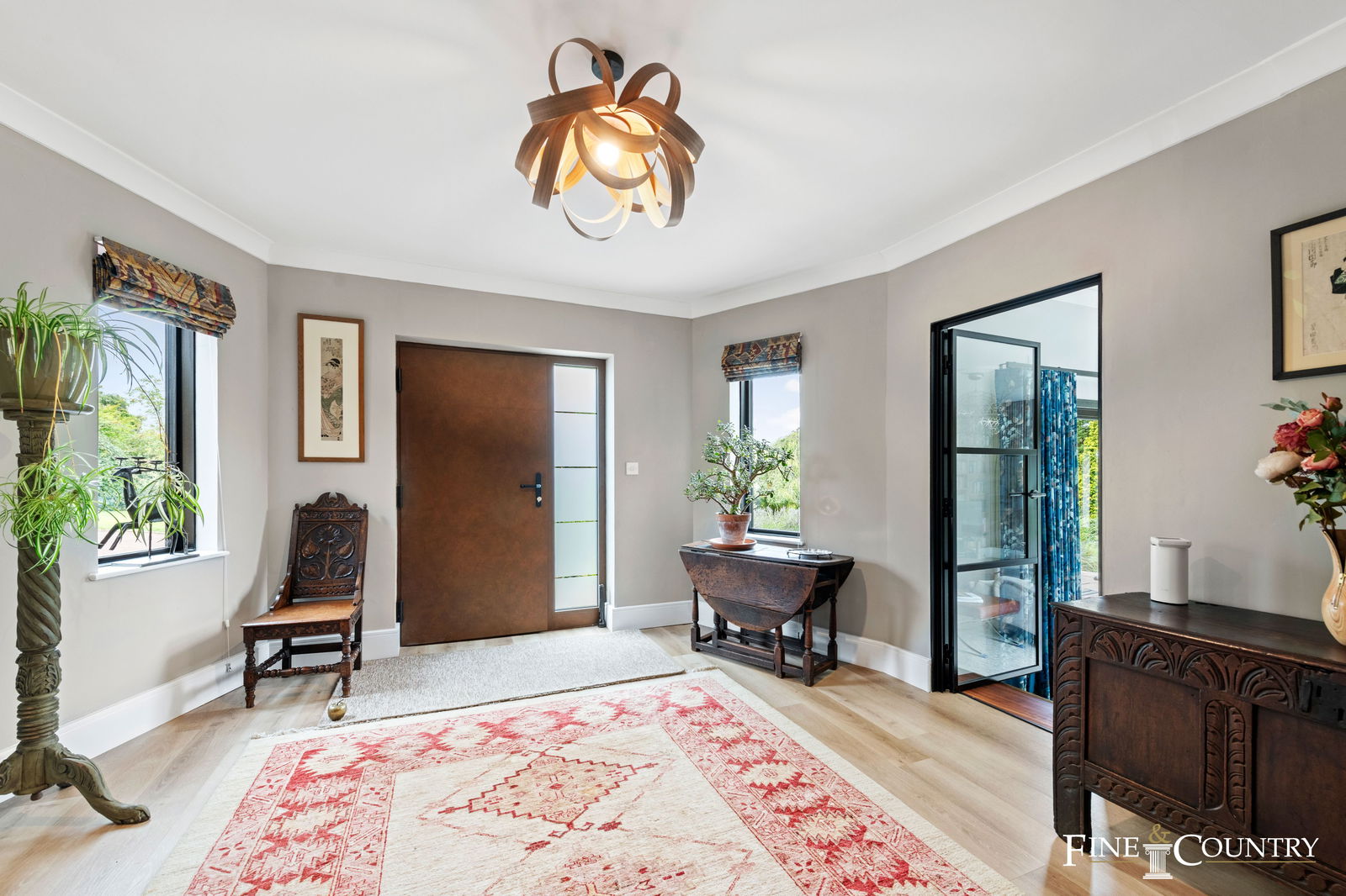 The property is enveloped by its own private gardens and commands a captivating outlook over a spring-fed lake, creating an enviable retreat for those who appreciate both natural beauty and modern design. The lake, alive with the gentle play of ripples from its constant water source, is an ever-changing haven for wildlife. Visitors include the stately heron, the occasional cormorant, and flashes of turquoise and amber from darting kingfishers. Resident families of ducks and moorhens bring the water to life, with their fluffy ducklings and chicks a joy each spring. Beyond, lambs graze in the meadows, completing a pastoral scene of rare serenity.