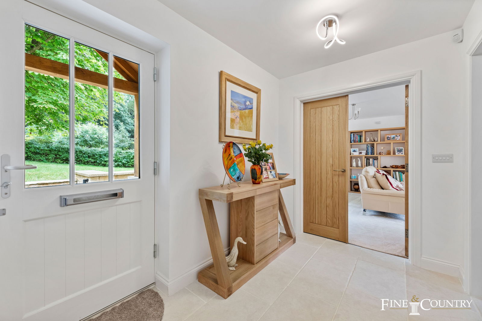 Arranged over two floors, the house offers a well-balanced layout with a flowing ground floor and four double bedrooms above. Stepping inside, the welcoming entrance hall sets the tone with its sense of calm and light. From here, doors lead to the main living areas including a beautifully proportioned reception room to one side. This is a room made for all seasons, with full-height windows and bi-fold doors that frame views of the garden and flood the space with natural light. In the cooler months, the wood-burning stove provides a warm and cosy focal point.