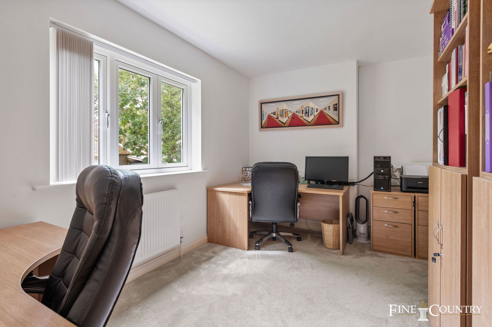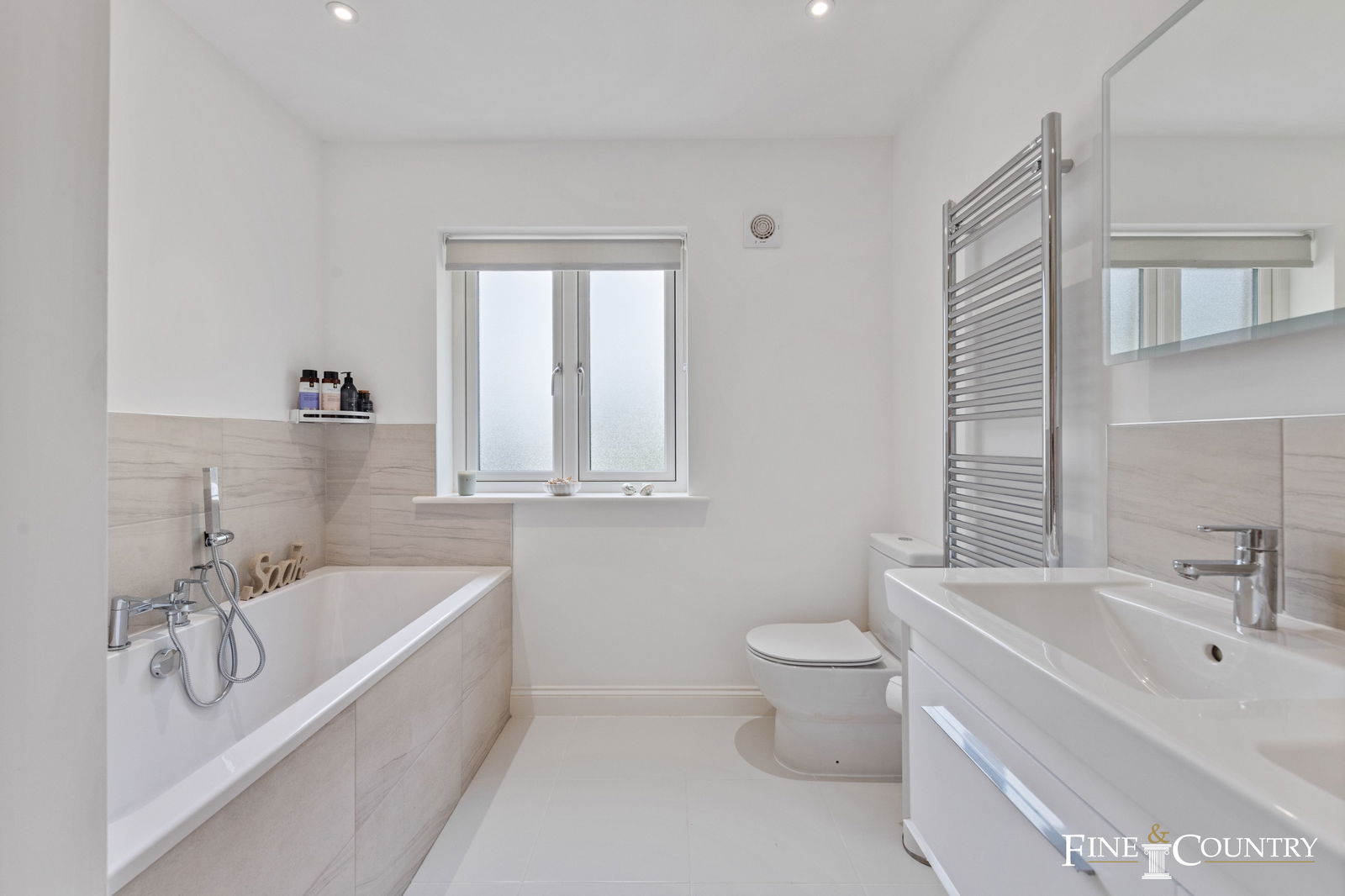 Upstairs, the layout continues to impress. The principal suite spans the depth of the house and comprises a spacious double bedroom, an en suite shower room and a fully fitted dressing room. The wardrobes here, and in the main bedroom, were custom installed by Sharps, ensuring a smart use of space. Three further double bedrooms are arranged off a central landing, two of which share a stylish Jack and Jill en suite, while the fourth has access to the well-appointed family bathroom. Each bedroom is light, bright and beautifully finished, making this an ideal home for families, visiting guests or even those needing a separate space to work from home.