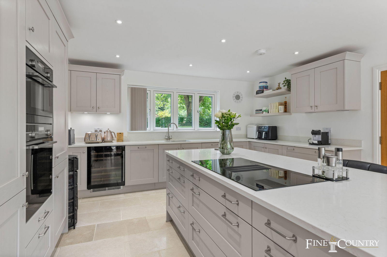 Adjacent to the reception room is the formal dining room, ideal for entertaining guests or enjoying family dinners. Beyond this is the real heart of the home, a beautiful open-plan kitchen and breakfast room with sleek lines and ample space to cook, dine and relax. Here, full-height bi-fold doors open directly onto the garden terrace, creating a seamless transition between inside and out. The current owners say they have spent much of their time in this part of the house, drawn by the peace and tranquillity of the setting. Whether enjoying a quiet morning coffee or hosting friends on a summer’s evening, this space has served as the perfect backdrop.