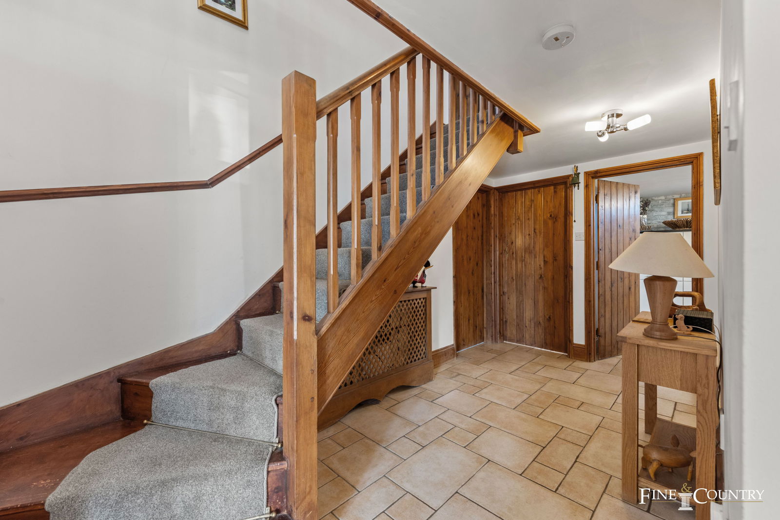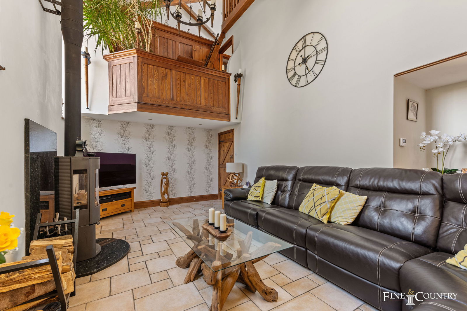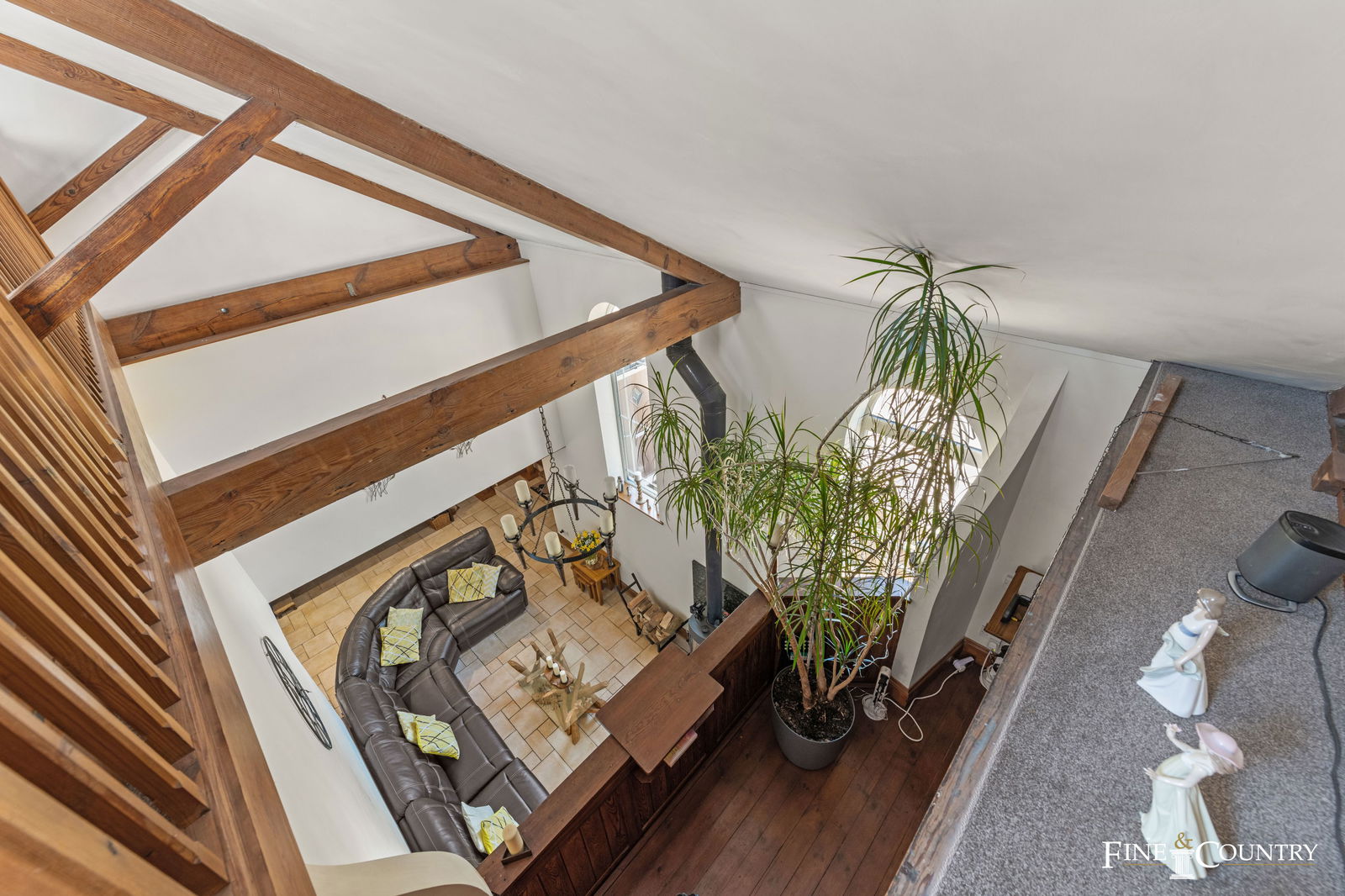 Thoughtfully renovated, the home preserves its original beams, pulpit, and even an original church pew in the reception room, which features a minstrel gallery and a vaulted ceiling, enhanced by a wood and metal candle chandelier. The cosy ground floor also includes a sitting room, a newly upgraded kitchen, a formal dining room and a utility/boot room. Upstairs, the first floor hosts four double bedrooms - the master suite boasts built-in wardrobes and a modern en-suite, while a charming attic room offers a cosy atmosphere.