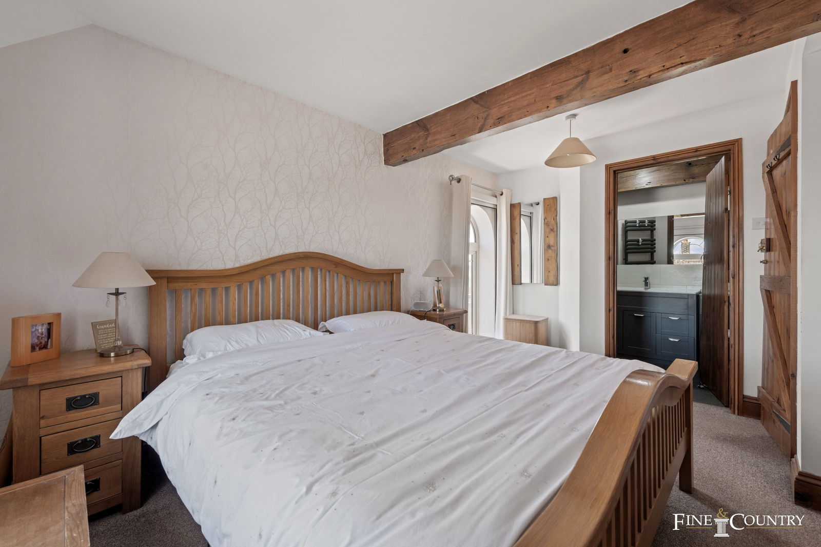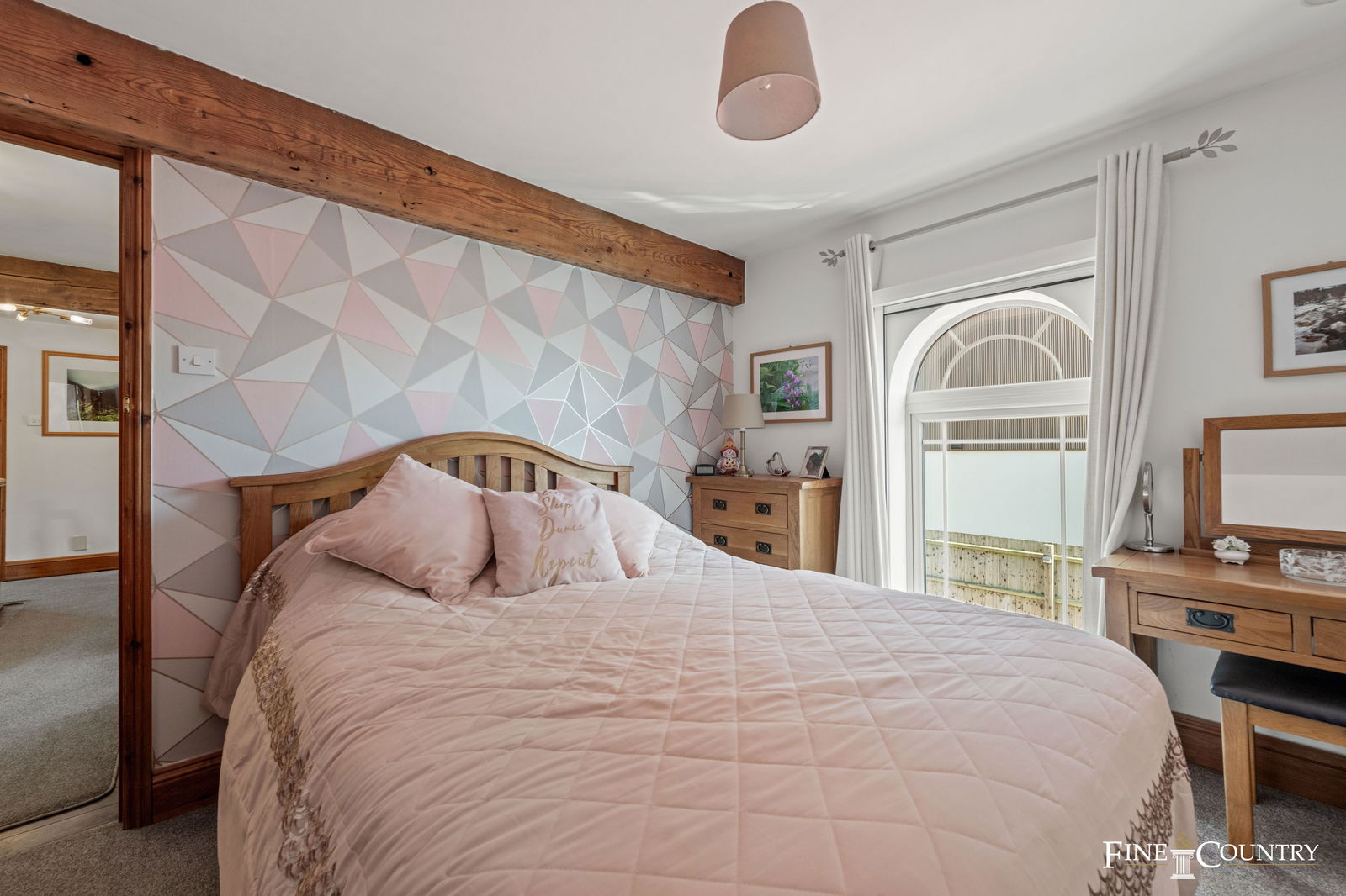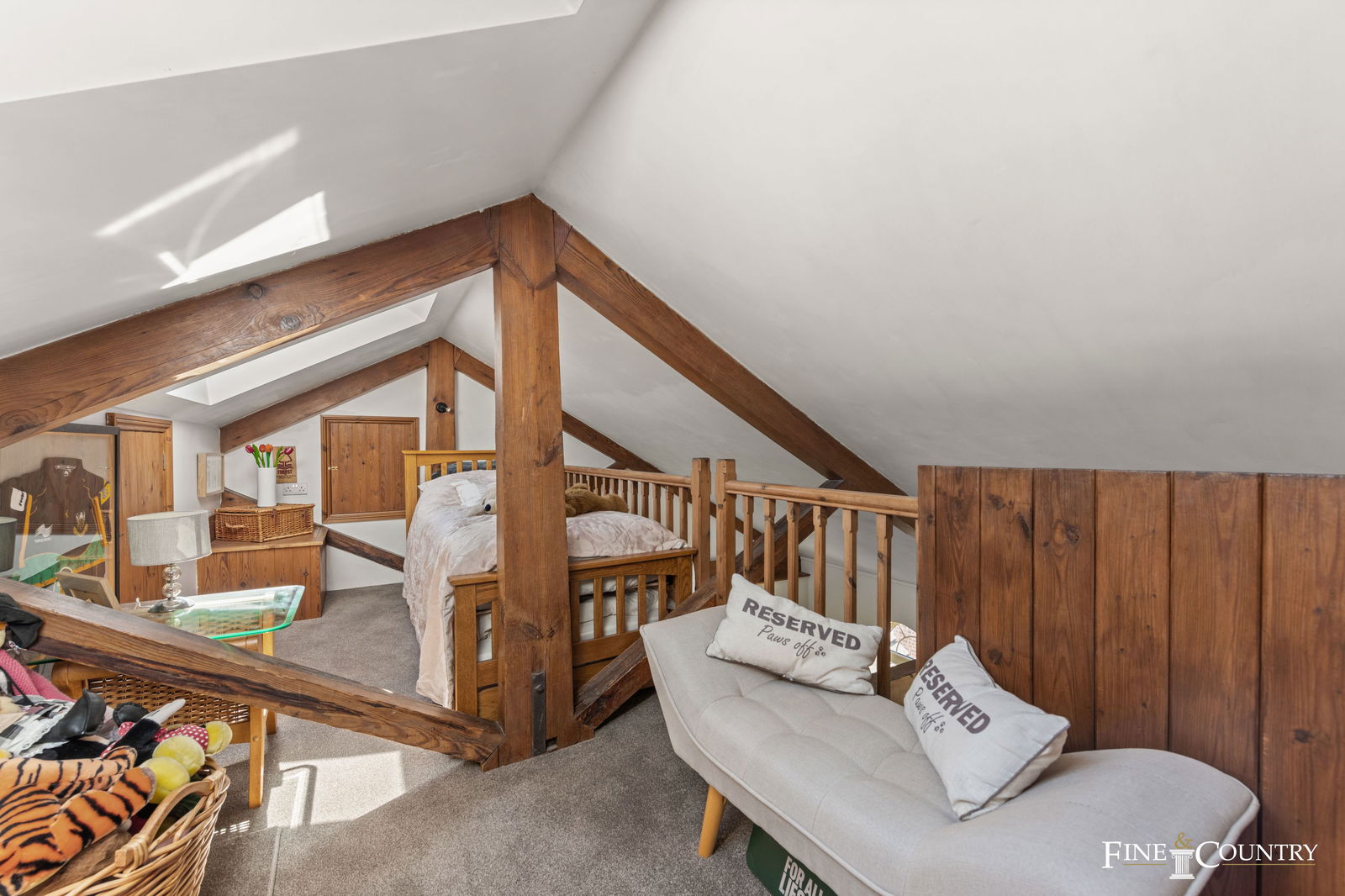 Upstairs, the first floor hosts four well-proportioned double bedrooms. Some benefit from arched windows set at floor level, creating serene, characterful spaces, while others enjoy elevated roof windows that bathe the rooms in natural light and offer added privacy. The principal suite features dual-aspect views, built-in storage, and a modern en-suite shower room. A particularly enchanting room tucked into the eaves captures attention with its exposed rafters and whimsical, cocoon-like charm – an inviting, nest-like retreat.