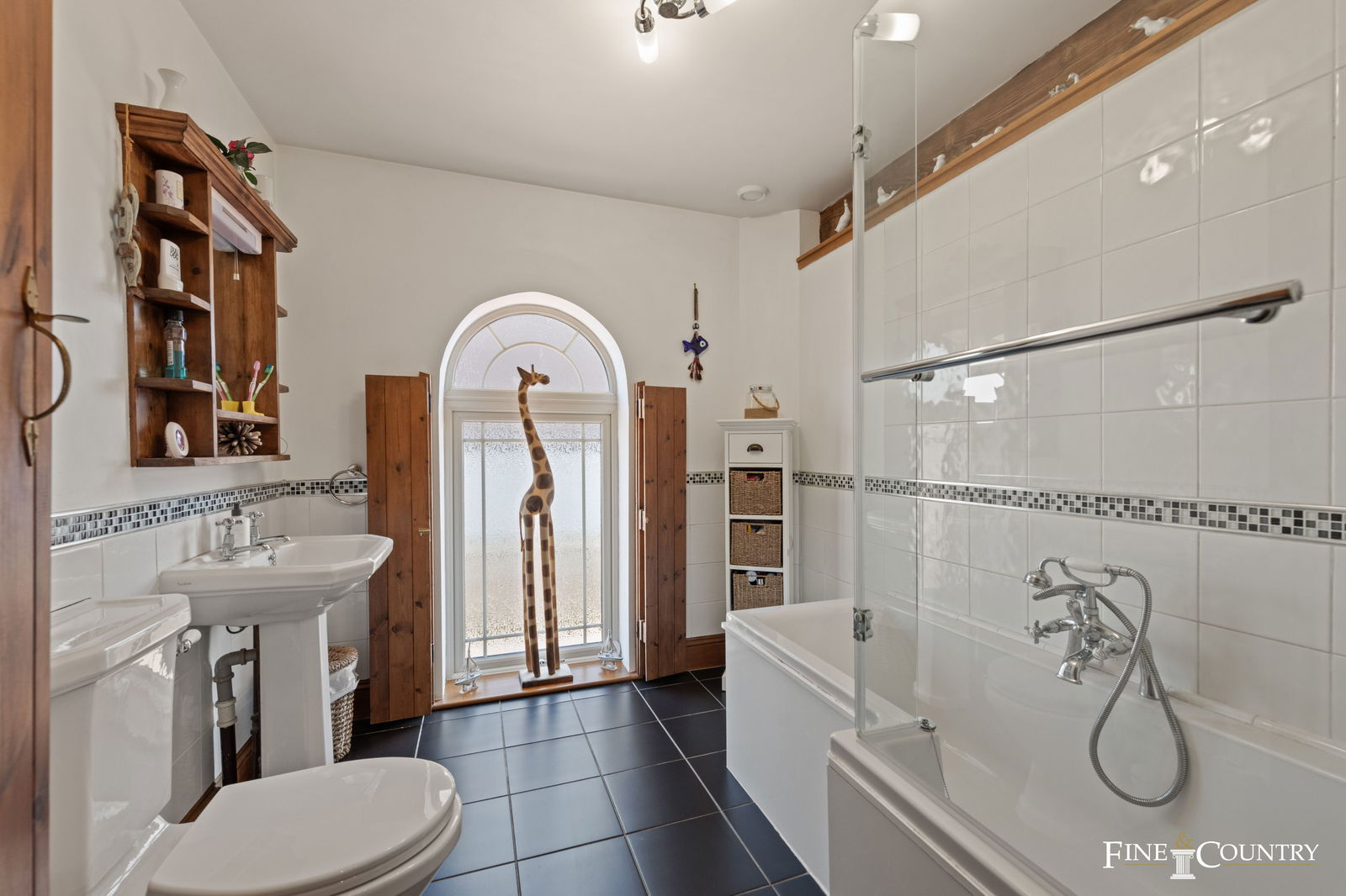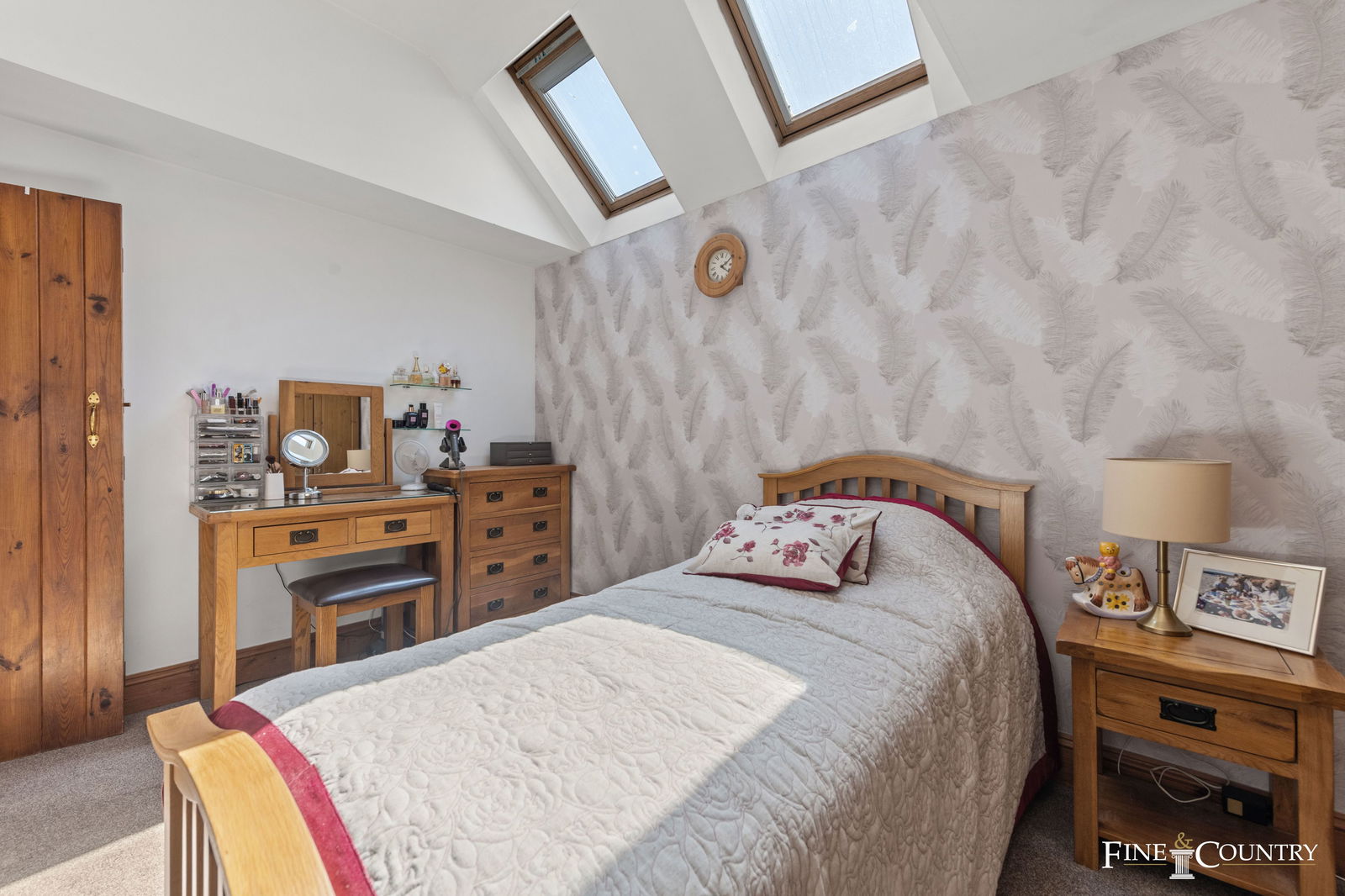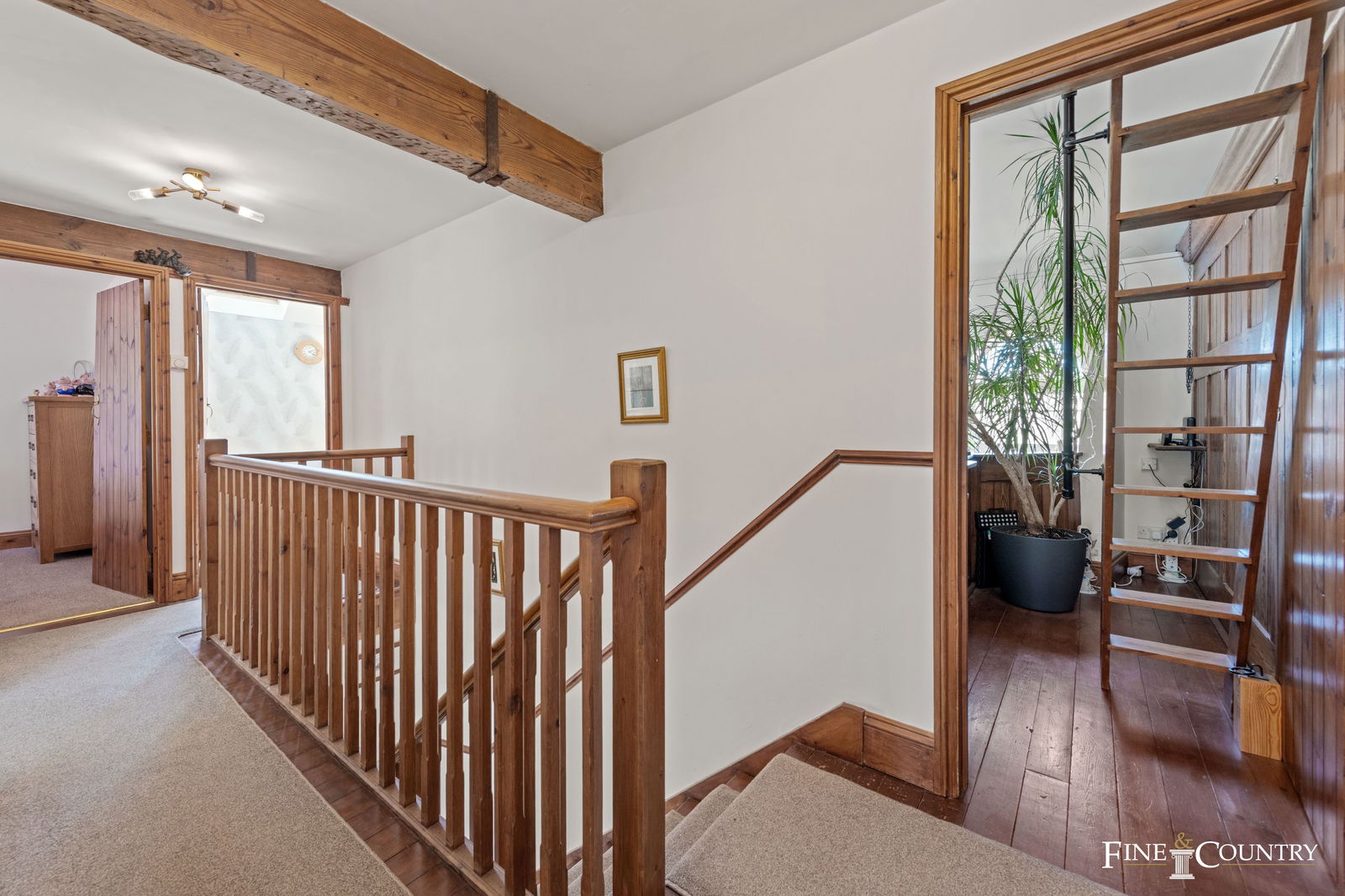 Upstairs, the first floor hosts four well-proportioned double bedrooms. Some benefit from arched windows set at floor level, creating serene, characterful spaces, while others enjoy elevated roof windows that bathe the rooms in natural light and offer added privacy. The principal suite features dual-aspect views, built-in storage, and a modern en-suite shower room. A particularly enchanting room tucked into the eaves captures attention with its exposed rafters and whimsical, cocoon-like charm – an inviting, nest-like retreat.