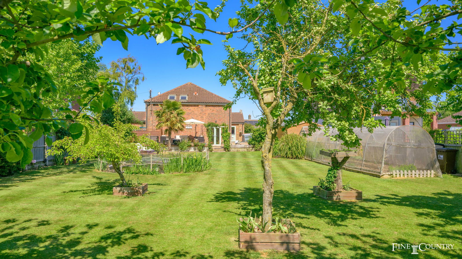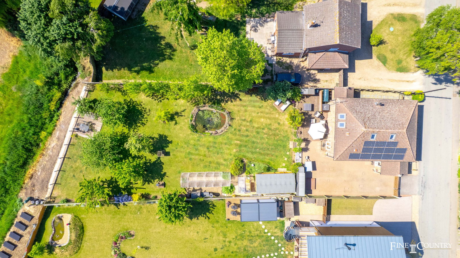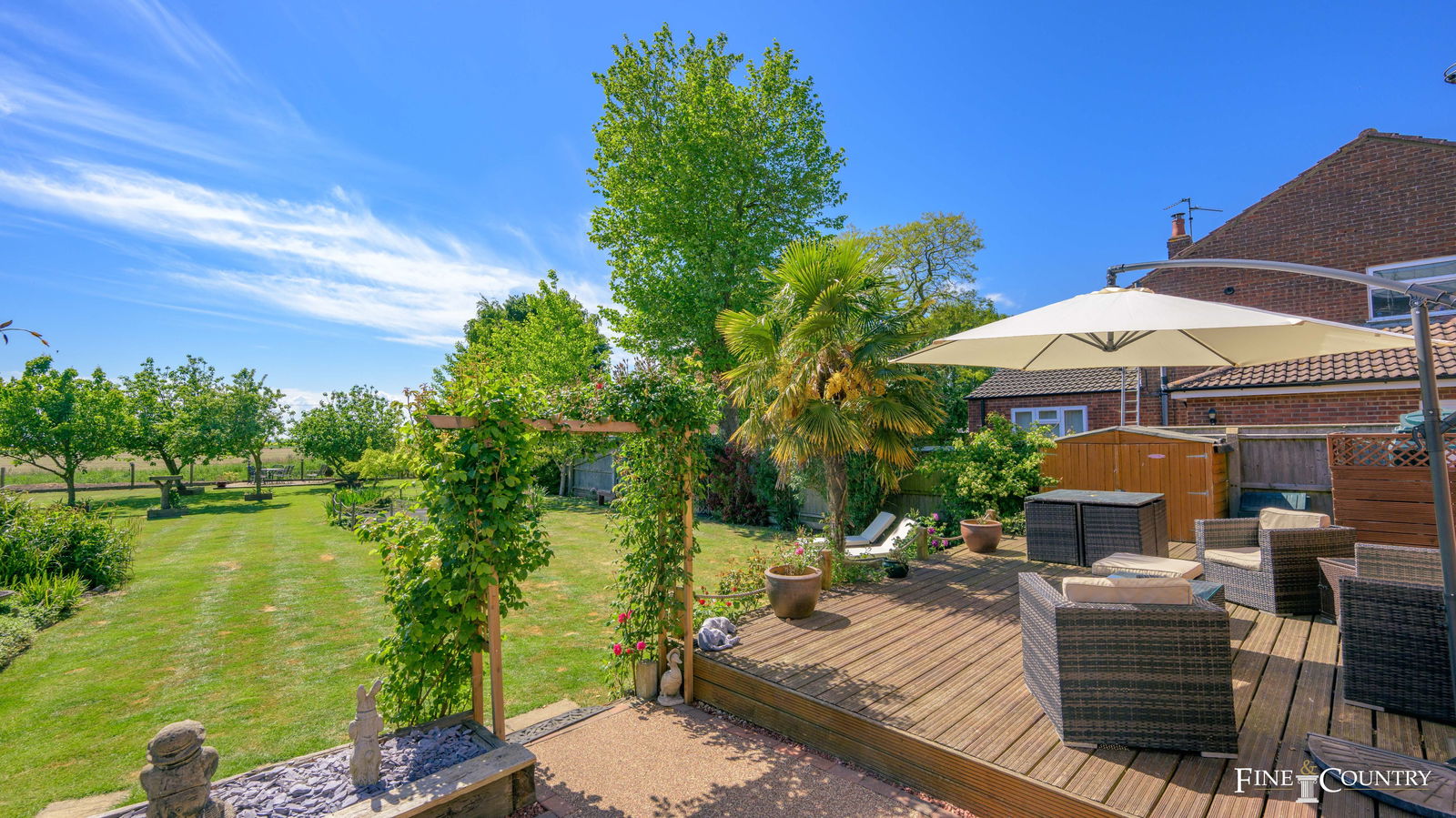 Set on circa 0.25 acre, the property features a spacious rear garden with two large decking areas, ideal for sunbathing and al fresco dining, along with a well-stocked fishpond, vegetable garden, and small orchard. Ample parking is available in the large forecourt accessed through side gates.