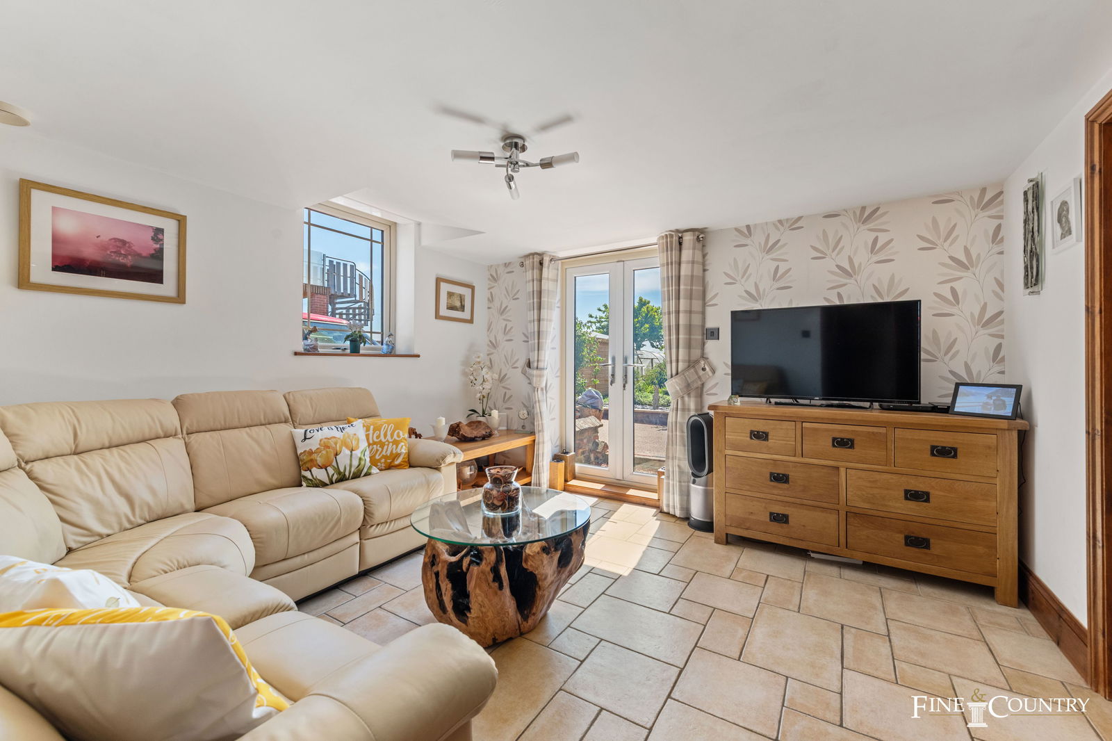 The exterior of The Old Chapel House is equally impressive. Set within approximately 0.25 acre (subject to measured survey), the grounds include a generous lawned rear garden with two substantial decked terraces. The first, positioned directly behind the house, is a sheltered sun trap – perfect for al fresco dining or leisurely afternoons. The second is located at the end of the garden and offers a peaceful vantage point to enjoy panoramic sunsets over the adjacent farmland. Additional outdoor features include a well-stocked fishpond, a productive vegetable plot, and a charming small orchard.