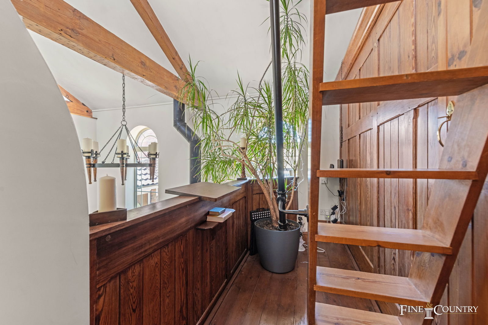 Extensive renovations have been carried out with sensitivity to the building’s historic charm. Original features such as exposed beams, the former pulpit, and even a traditional church pew – now providing additional seating in the reception room – have been retained. This main reception area is graced by a vaulted ceiling and minstrel gallery, reinforcing the chapel’s heritage. The ambiance is elevated further by wrought-iron wall sconces and a striking wood-and-metal chandelier.