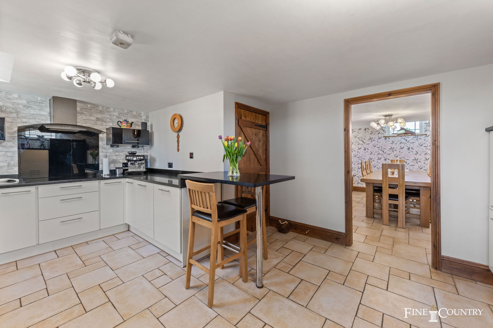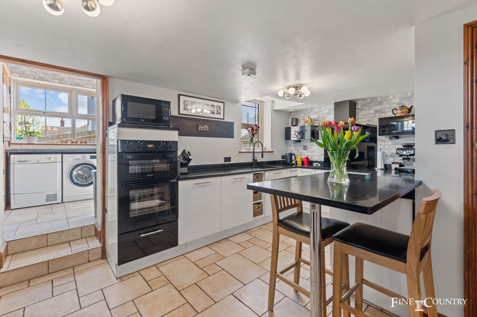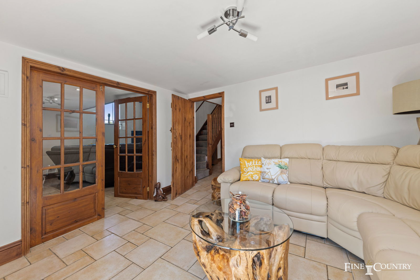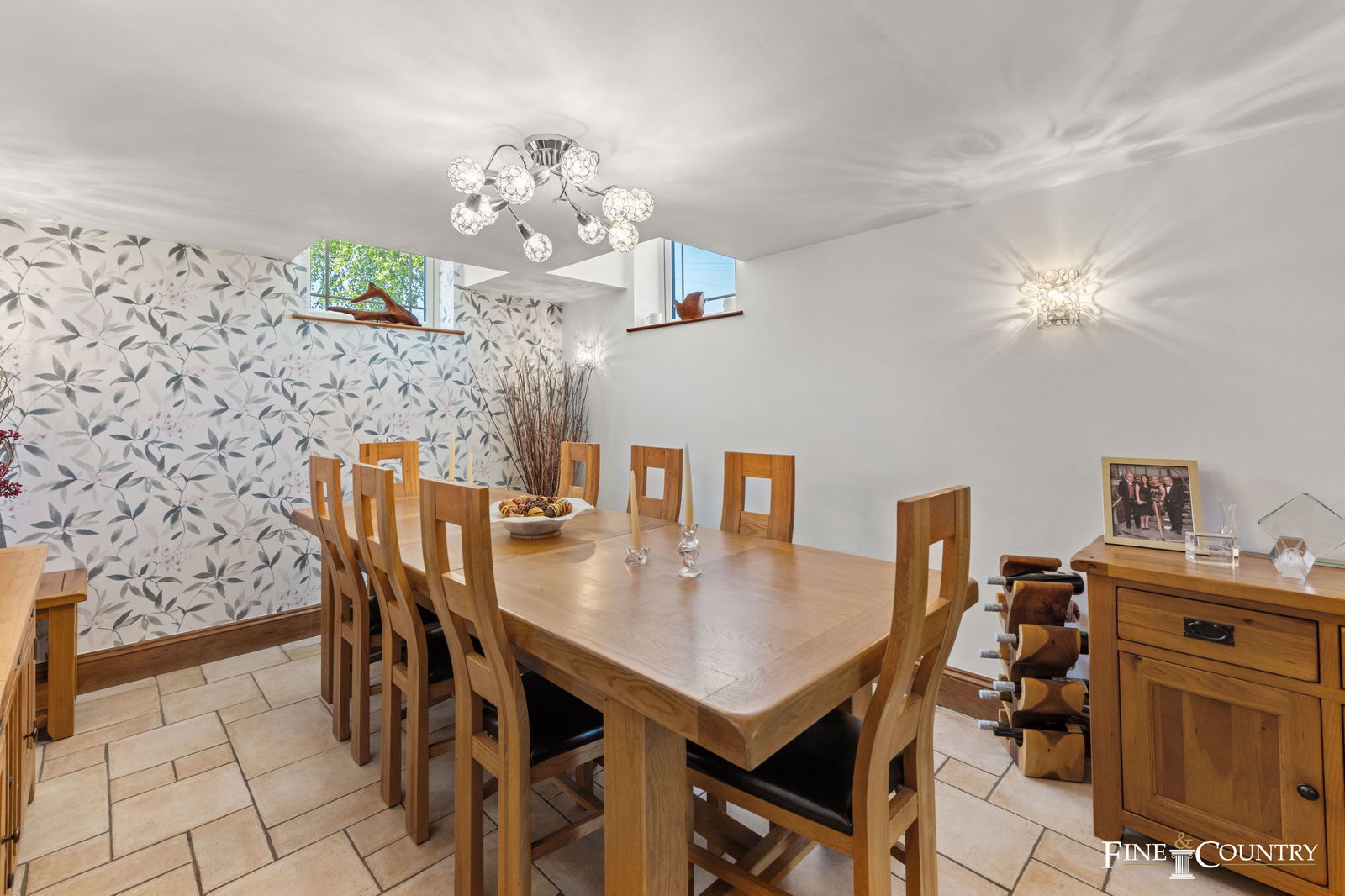 In addition to the main reception, the ground floor also includes a cosy sitting room, complete with French doors that open directly onto the rear garden – ideal for indoor-outdoor living. The recently upgraded kitchen introduces a sleek, contemporary contrast, seamlessly flowing into the formal dining room on one side and a practical utility/boot room on the other.