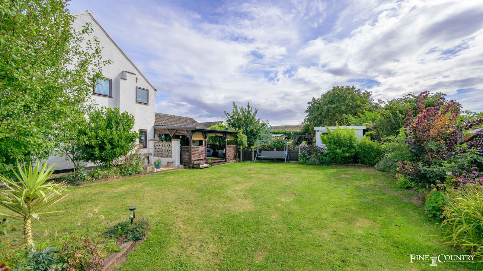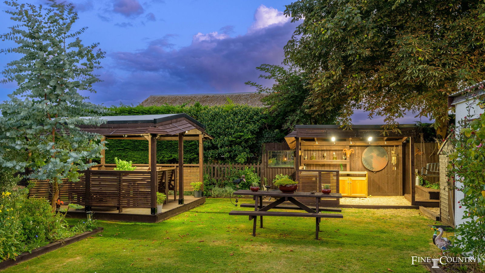 The gardens have been thoughtfully designed as a series of outdoor rooms, including sheltered seating areas, dining terraces, and covered barbecue and kitchen spaces. Tucked behind the garage lies a hidden gem: a secluded garden revealed only once the outbuildings are passed. This sizeable, enclosed plot features lawns, planting, bird boxes and views over farmland.