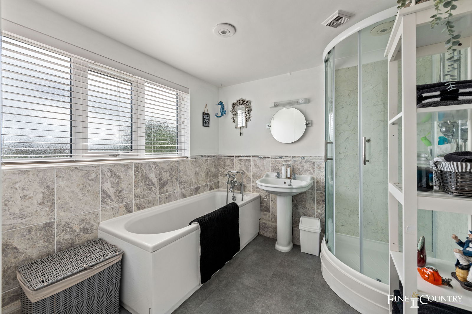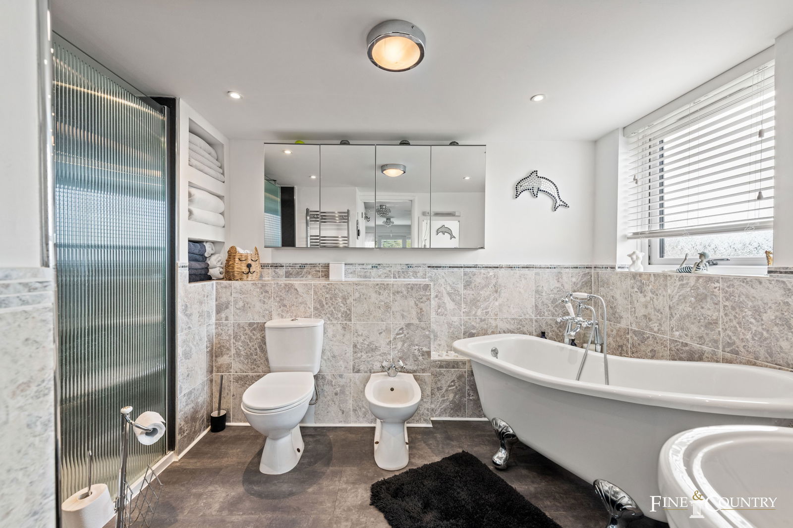Upstairs, four well-proportioned double bedrooms are served by a family bathroom, while the principal suite benefits from its own private bathroom.