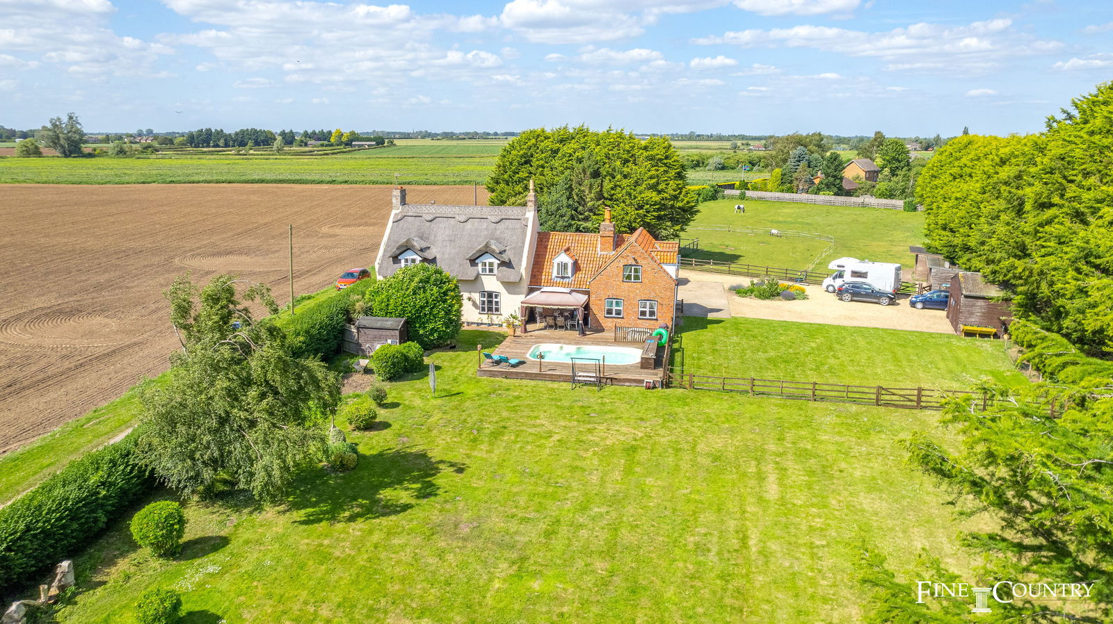 A charming, thatched cottage sits in an idyllic rural spot surrounded by its garden and paddocks just north of the market town of Spalding with easy access to excellent schools, shopping and facilities. The grade II listed property is full of character and enjoys a good connection with the garden and its swimming pool and offers a generous living room, a formal dining area, a family room, a kitchen, a utility room and a cloakroom on the ground floor, and four bedrooms and a family bathroom on the first floor. The sizeable annex could be used for extra accommodation or be an extensive office suite for a business. Further outbuildings include a workshop and storage. The property sits on just under two acres and is fully enclosed. A gravelled drive offers parking for numerous vehicles and a timber double garage stands at the far end. The equestrian facilities include an approximately one acre post and rail paddock and three timber stables.